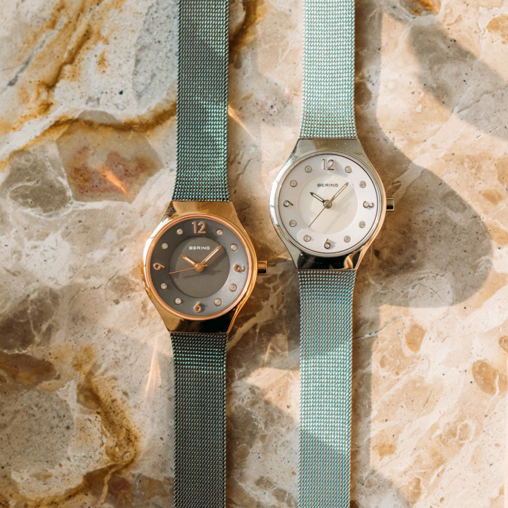 ブレスレットの様に全体をワントーンで統一したシルバーカラーと、エレガントな印象を与えるローズゴールドケースとチャコールグレーがコンビになった2カラーからお選びください。