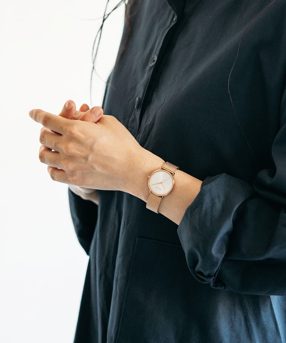 シンプルなダイヤルのデザインはレザーストラップとメッシュストラップで表情を変えてお楽しみいただけます。