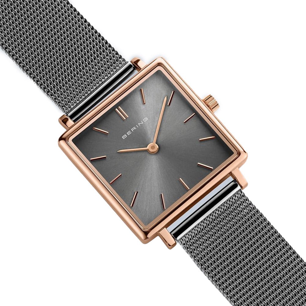 ベーリング 18226-369はバーインデックスのシンプルな文字盤に、26mmとミニマムで特徴的なスクエアケースを合わせたクラシカルなコレクション。コーディネイトしやすいカラーリング、通年で使用しやすいメッシュベルトなど、使い勝手がよく、流行りすたりの無いタイムレスなモデルに仕上げています。