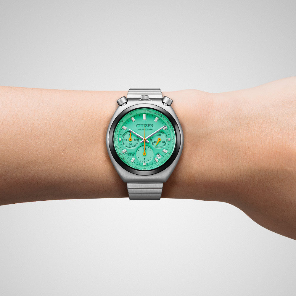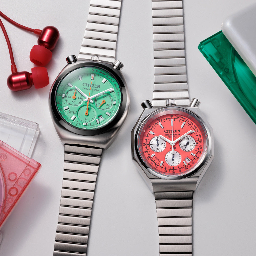 レトロフューチャーなデザインが人気のレコードレーベルから限定ウオッチが登場。レトロな外装と1990年代のプロダクトを思わせる個性的なカラーで、遊び心と懐かしさが同居するデザインです。文字板に夜光塗料を施し、その上にポップなカラーを重ねた特別仕様。光を蓄えると暗闇でも文字板全体がぼんやりと浮かび上がり、視線をキャッチします。