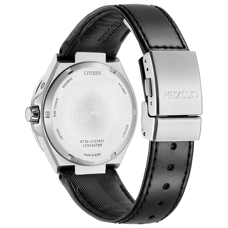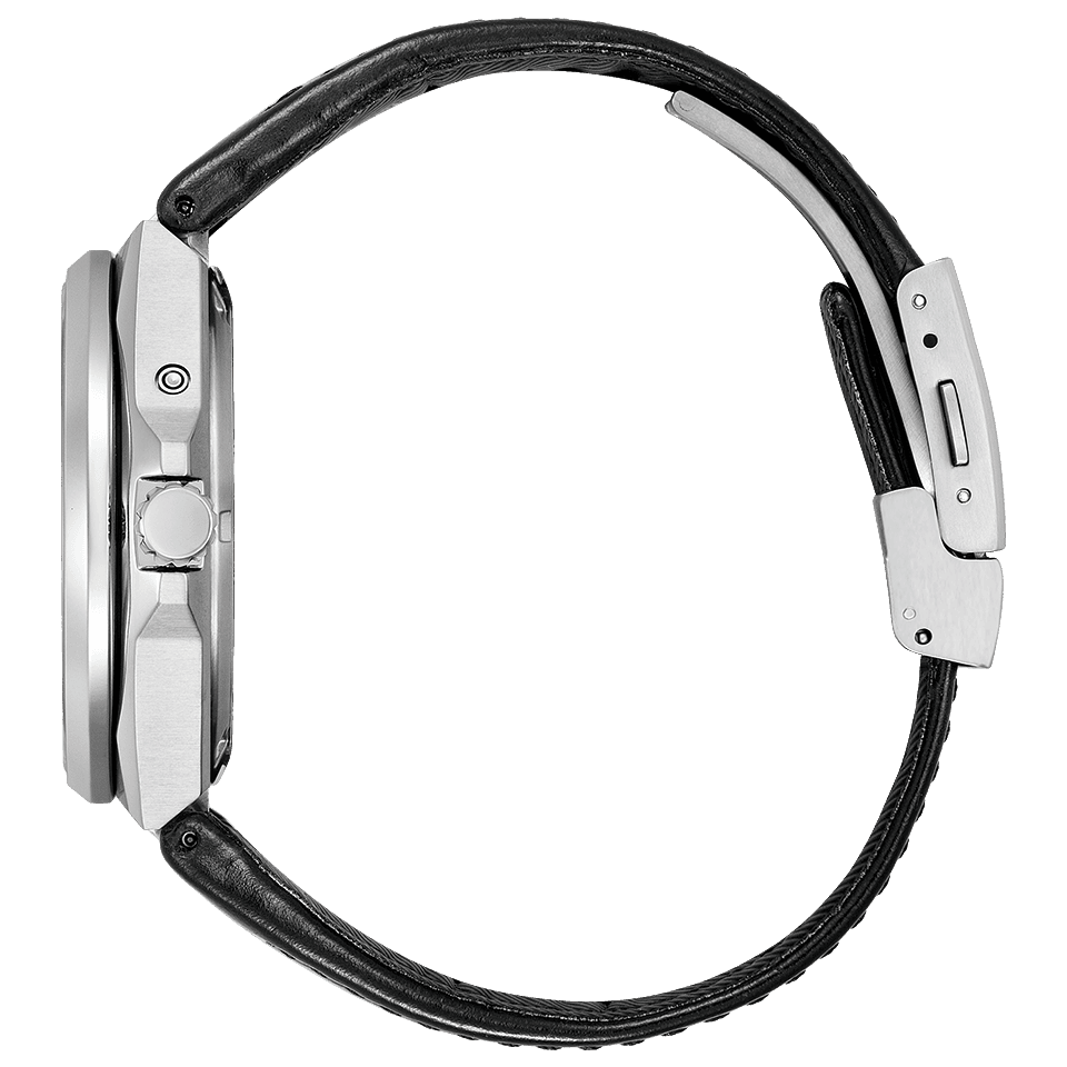 エコ・ドライブの中でも⽂字板の外周部分にソーラーセルを配した「リングソーラー」のムーブメントを⽤いることで、奥⾏きのある多層構造と⾦属製ダイヤルを実現しました。デザインの特徴では、グレーの文字板を基調にしながらも同系色のブラックを随所に配置。カーフ革バンドの色味と調和させることで、モデル全体に統一感を持たせています。