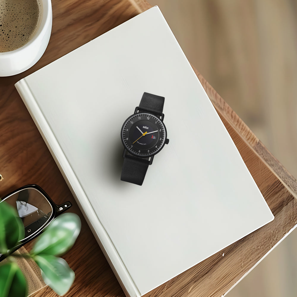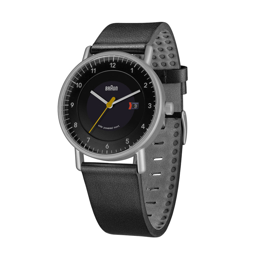 BRAUNのデザインヒストリーを象徴する黄色の秒針と、赤の日付表示を使用したクラシックで実用的なソーラーウォッチ。