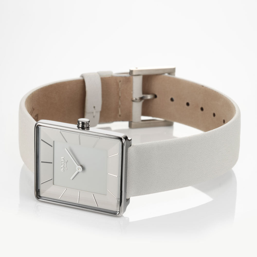 3351-01(Ladies Collection)はミニマルなデザインで、身に着けていることを忘れるくらいスリムで軽いレディースウォッチ。 長らくご好評いただいたレディースラインが、このたびリニューアル。 やさしい軽さと洗練されたフォルムで、毎日をそっと引き立てます。自分らしく過ごす時間に、ぴったりの1本をぜひ。 BOCCIA TITANIUM 3351シリーズは、洗練されたチタニウムケースに軽やかなレザーストラップを組み合わせた、ミニマルで上品なレディースウォッチ。 ケースサイズは25mm×28mmと手首にフィットする絶妙なサイズ感で、華奢な印象を与えながらも視認性はしっかり確保。 チタニウムならではの驚くほどの軽さと肌に優しい素材は、長時間の着用でもストレスフリー。 全4カラーから、あなたのスタイルに寄り添う1本を。