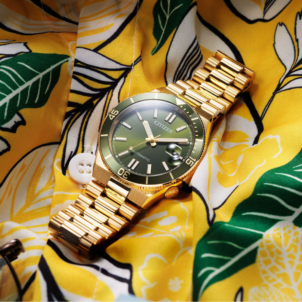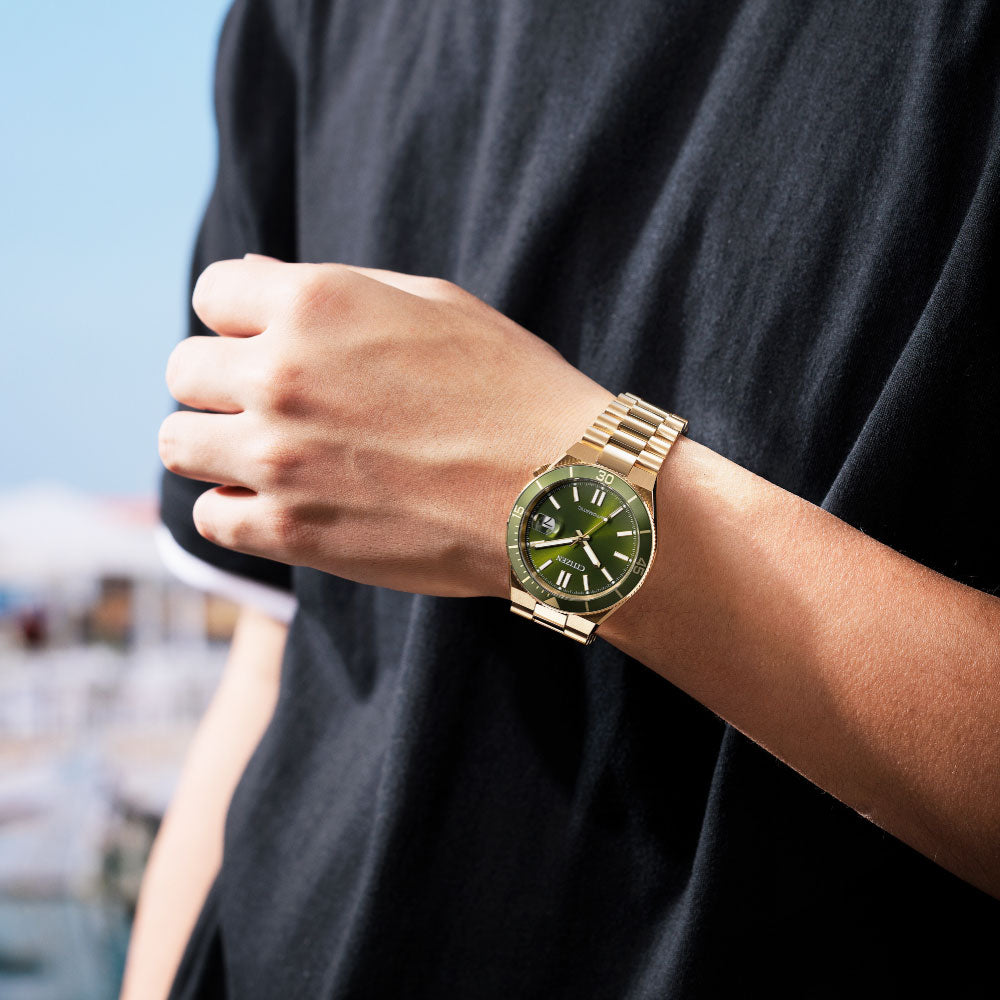 豊富なカラーバリエーションが人気のTSUYOSAから、「Shore(海岸)」をテーマに、海辺で感じる躍動感をデザインに落とし込んだ、力強くスポーティなルックスの新作が登場。着け心地にこだわった腕なじみの良い3列バンドに、上質な仕上げの中留板を採用し、高級感をプラス。着けているだけで楽しい気分になれる、カラフルで個性あふれる文字板カラーと120クリックの逆回転防止ベゼルが、時計を操作する楽しさを体験させてくれます。シースルーバックの裏ぶたで、機械式時計ならではの回転する錘(おもり)やメカの動きも楽しめます。アクティブなシーンでも活躍する10気圧防水仕様もポイント。