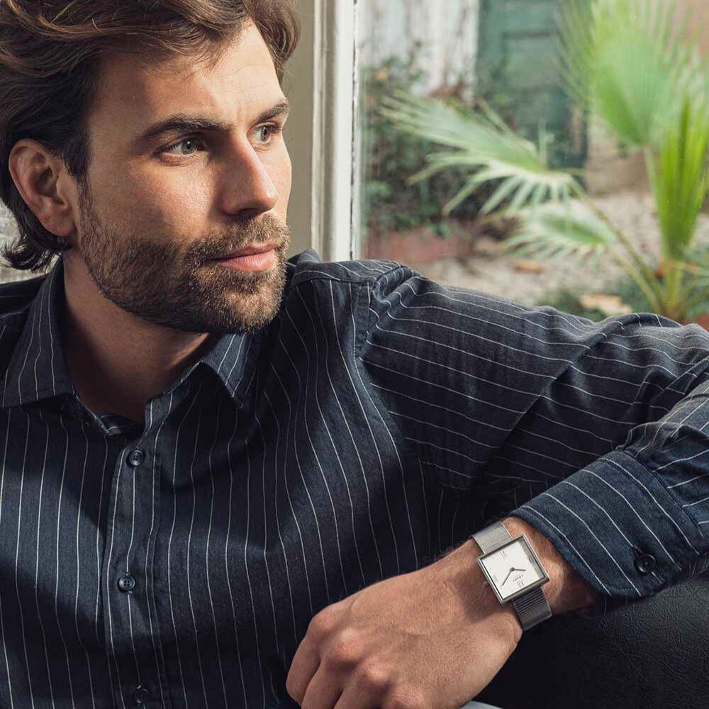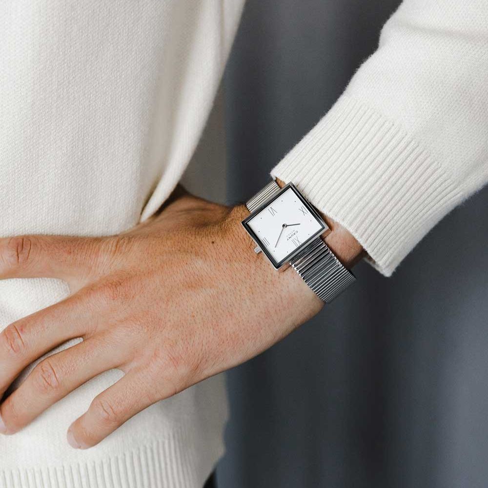 正面から見た時に完璧なスクエアシェイプを実現するために、ケース背面の溝にピンレバーのブレスレットを装着する構造を採用しました。