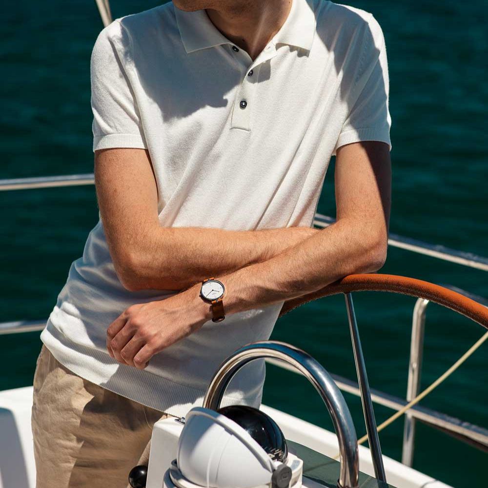 薄型のスチールケースとイタリア製レザーストラップは1つのリンクで繋がり、ブレスレットのような着用感です。