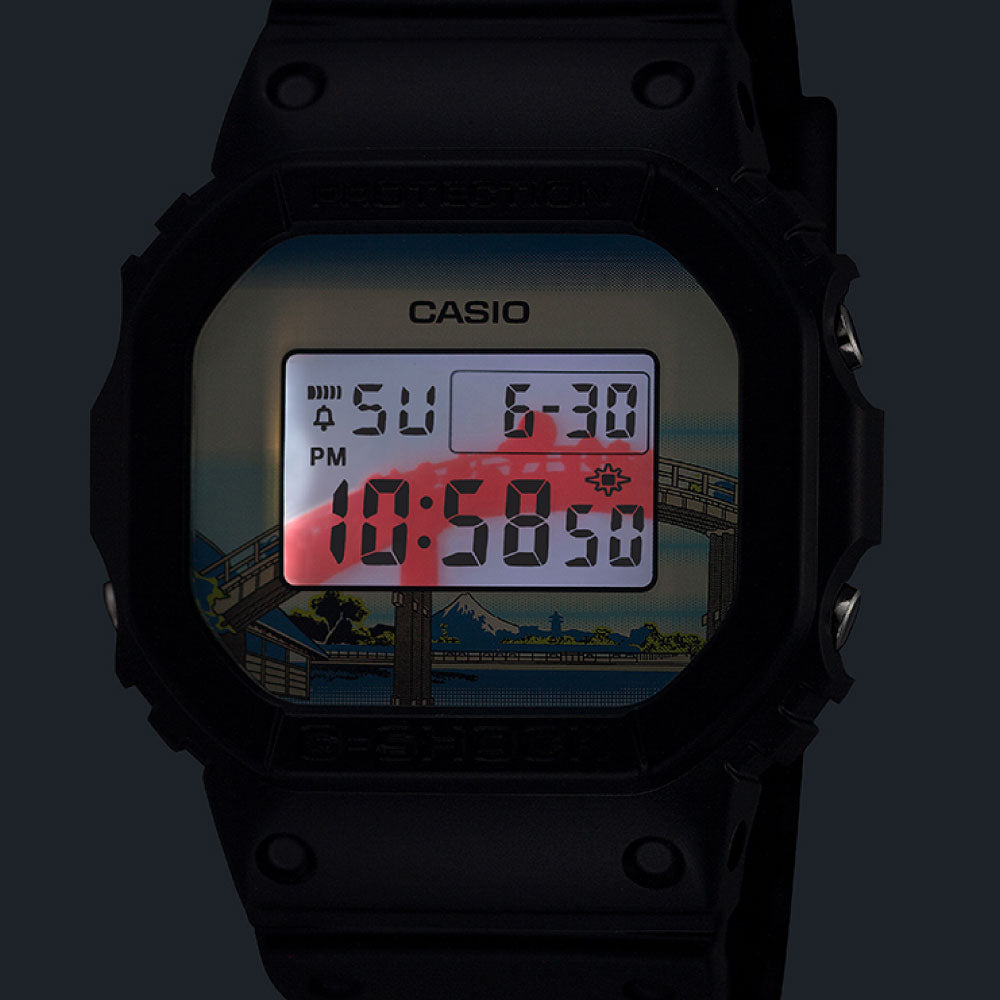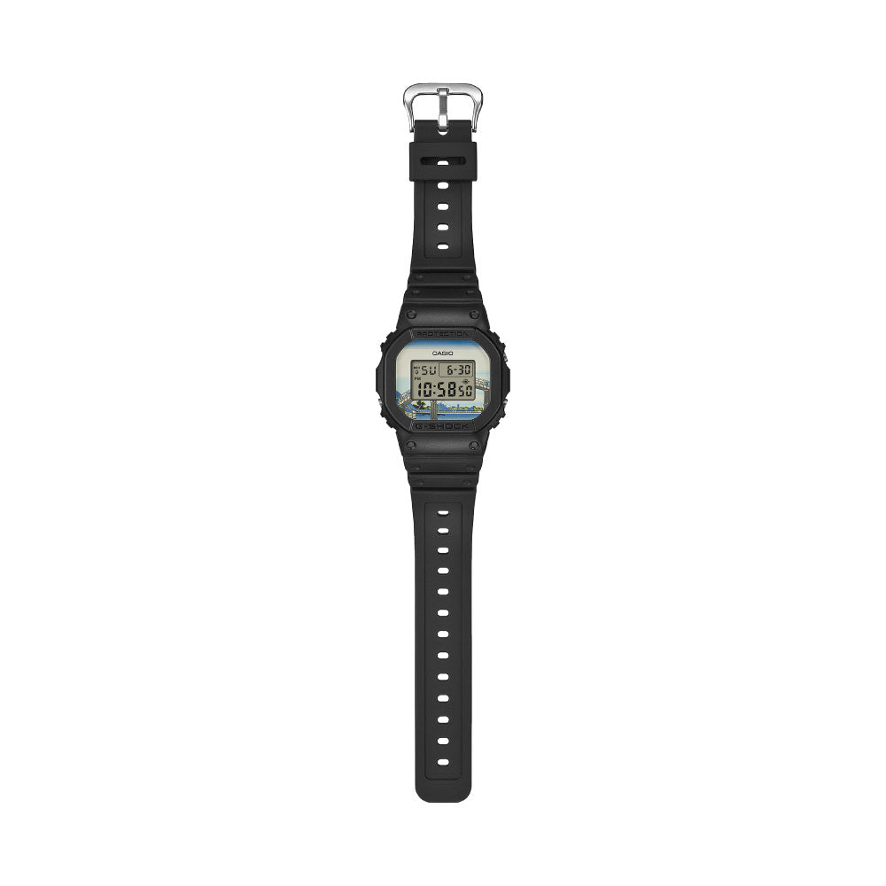 ベースモデルにはアイコニックな定番デジタルDW-5600を採用し、文字板には「深川万年橋下」を大胆にデザイン。