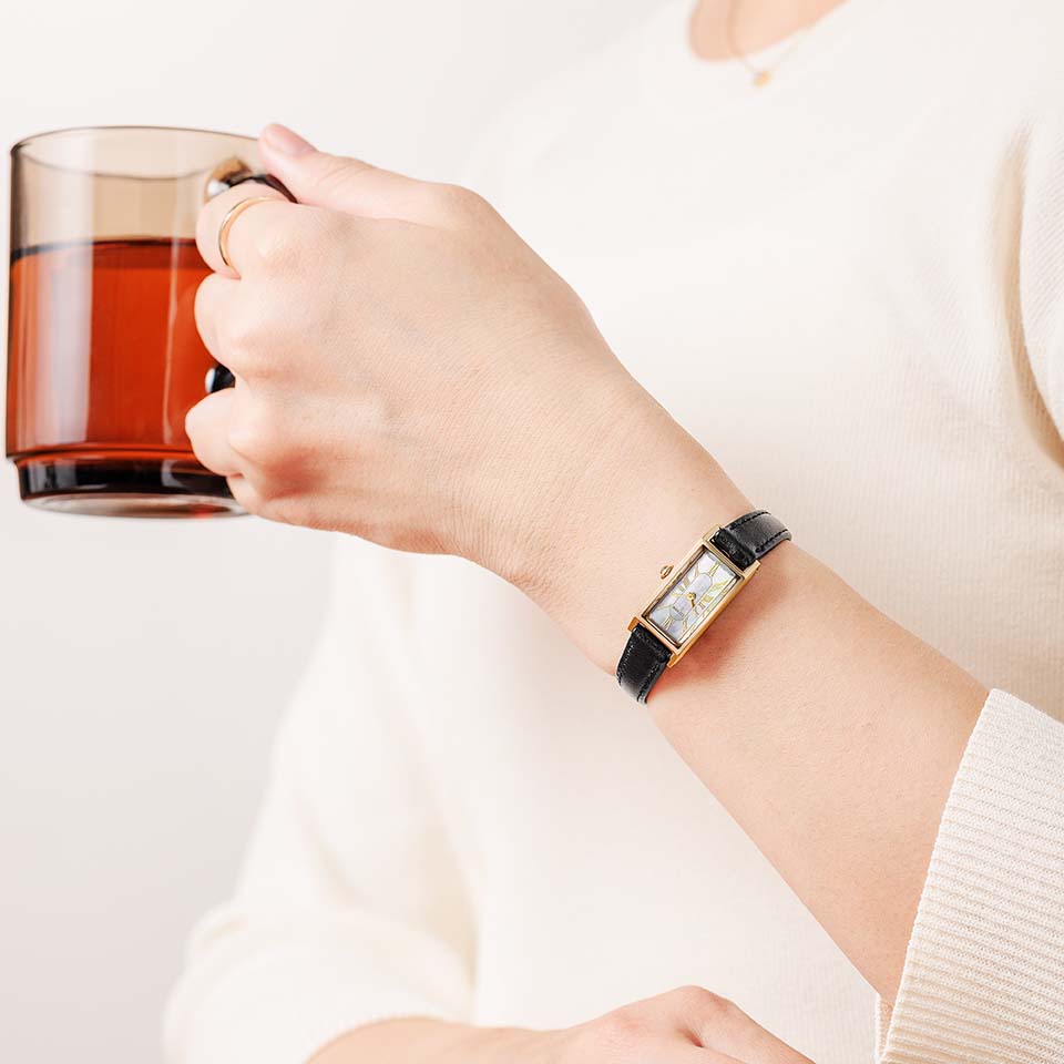 スリムな形状が人気のスクエアケースに、美しい白蝶貝文字板を合わせた限定モデル。文字板中央にギョーシェ彫りを思わせるパターンを施し、高級感と華やかさをきわだたせました。クラシカルな印象のメッシュバンドに、手元をクールに彩るネイビーの革バンドをセットした2Way仕様。ご自身で手軽にバンド交換ができるインターチェンジャブル構造を採用しています。