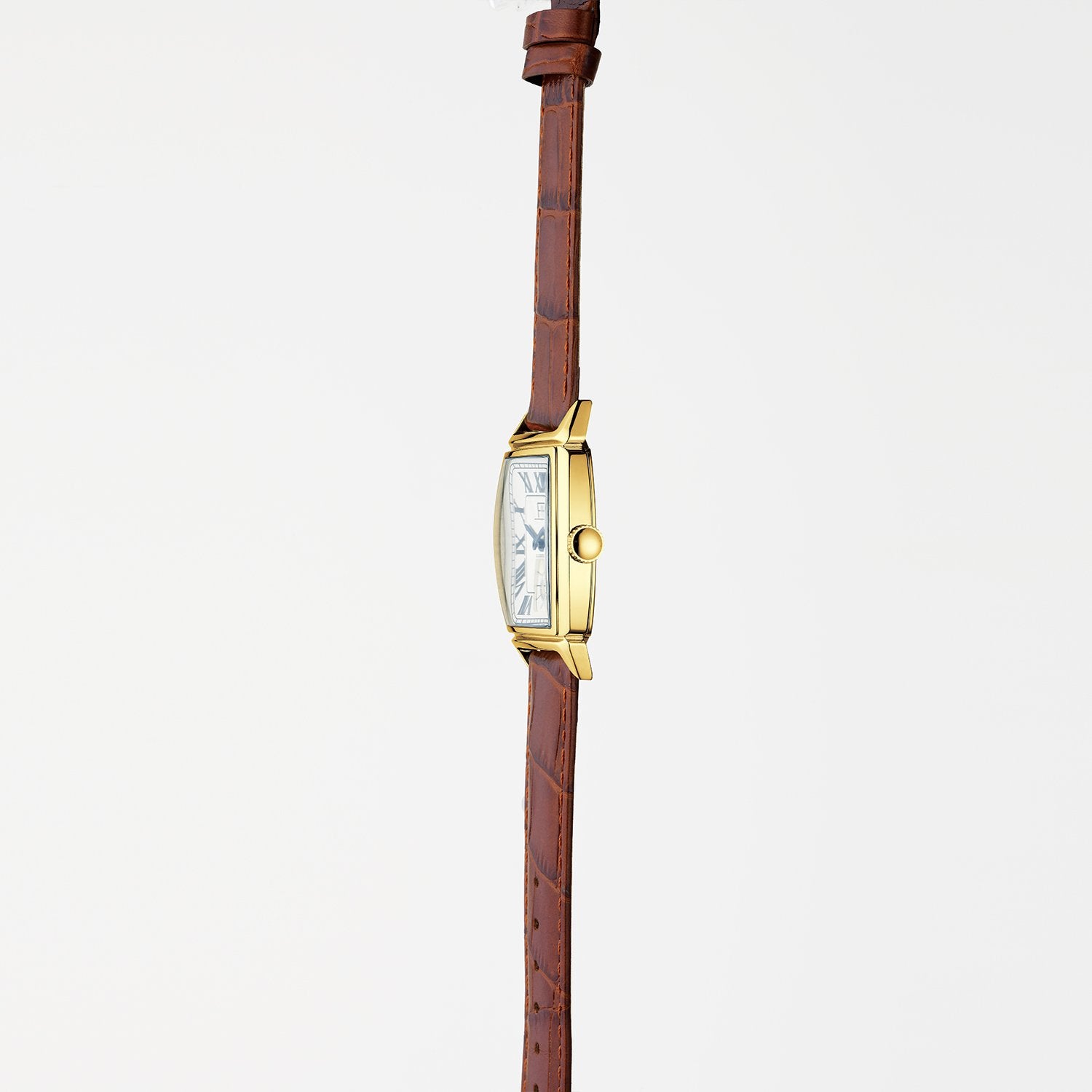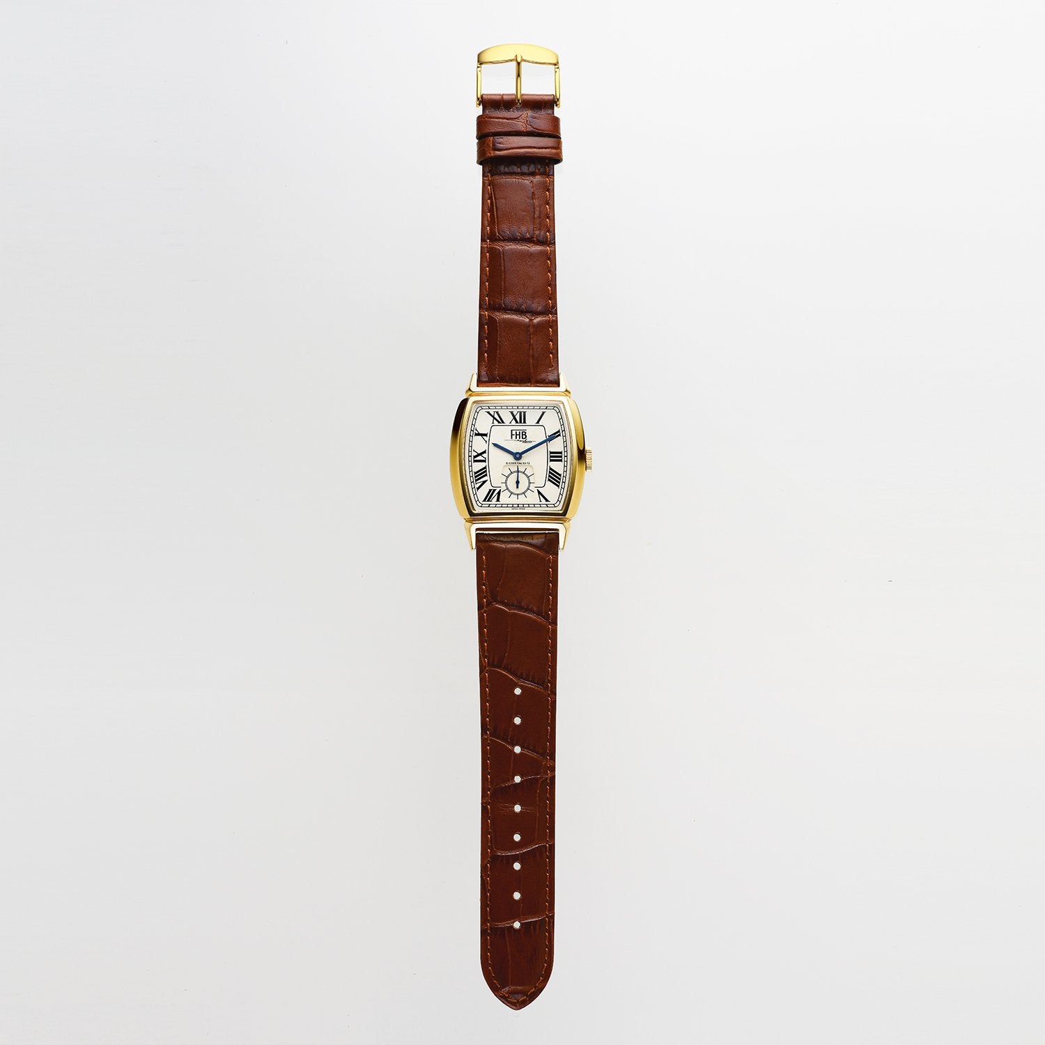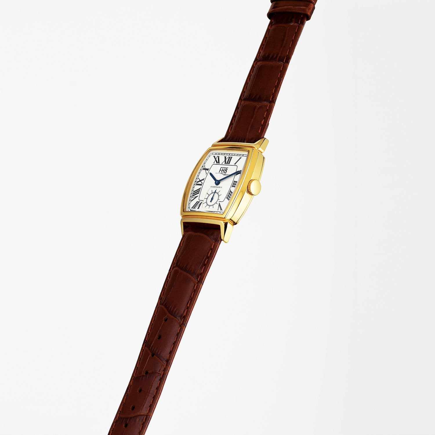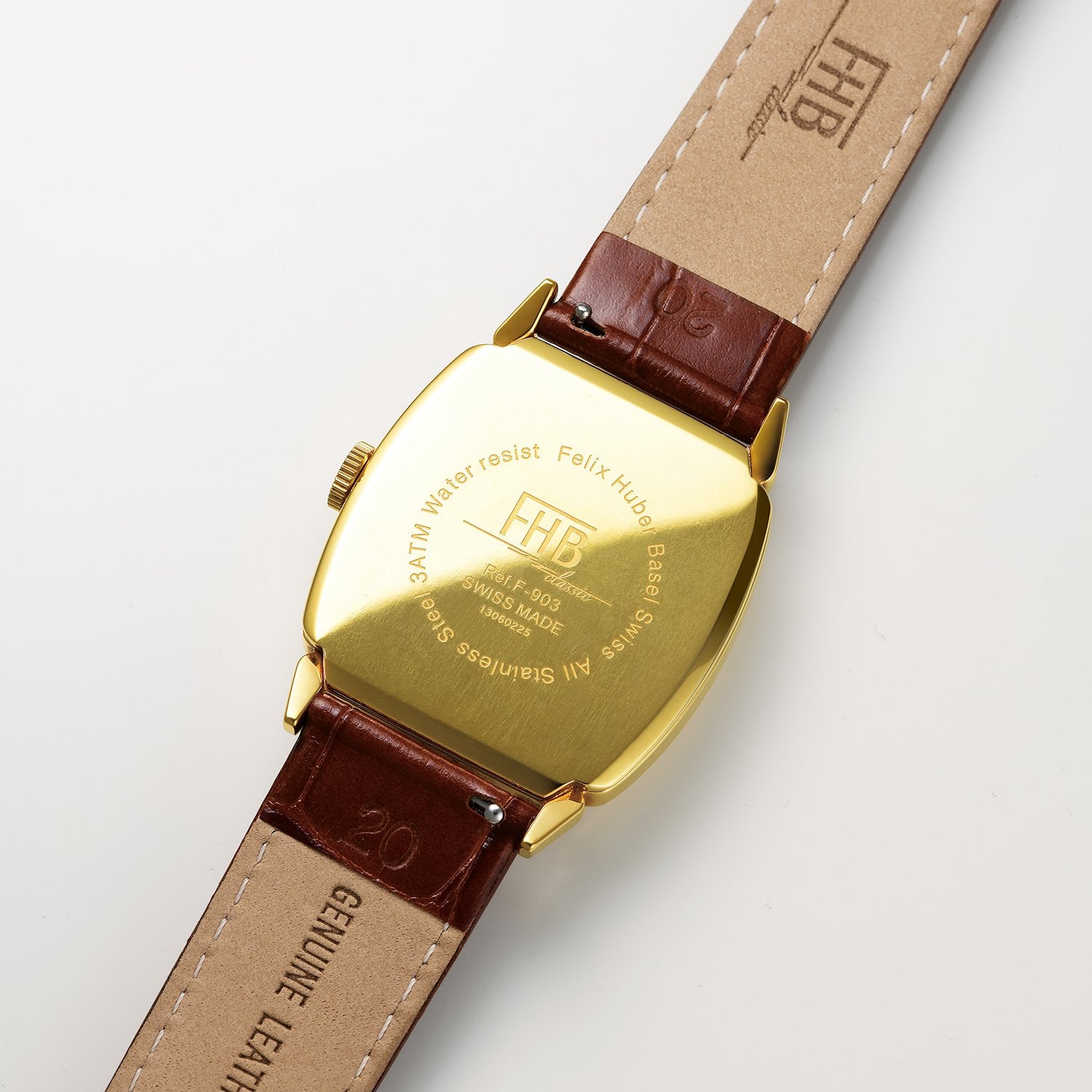 アール・デコスタイルのトノー型ケースをベースにした美しいフォルムが特徴のF903シリーズに新たな息吹をもたらすのは、ローマ数字のインデックスを採用し、ギョーシェ模様を取り入れ、クラシックな青いリーフ針がアクセントの2型。F903-YWR-BRは、イエローゴールドケースに型押しのこげ茶色レザーストラップを組み合わせた大人の余裕を漂わせるモデル。レイルウェイ目盛りと6時位置のスモールセコンドは既存のF903シリーズと同様に配置し、クラシカルな雰囲気を醸し出しています。文字盤にはHUBER氏がデザインを考える際、デザイン画の下に書かれたデザインコードが記されています。※全てシリアルナンバーが刻印されています。