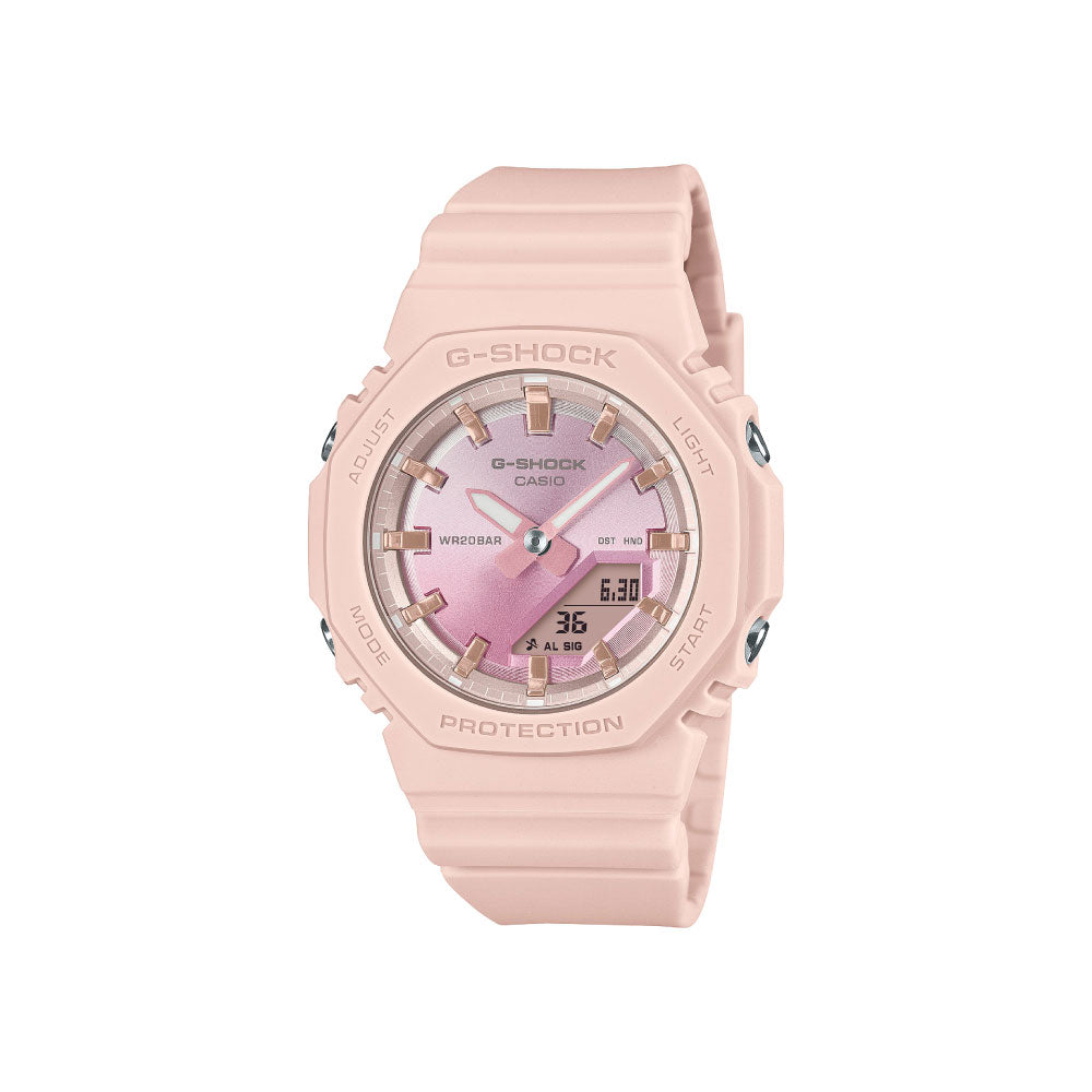 ベースモデルは、人気のデジタル・アナログコンビモデルGMA-S2100を更に小型化したGMA-P2100。バンドの長さも短くすることで、手首の細い方にもフィットするよう装着性を高めました。美錠とサイドボタンもステンレス素材を使用し、質感を高めています。