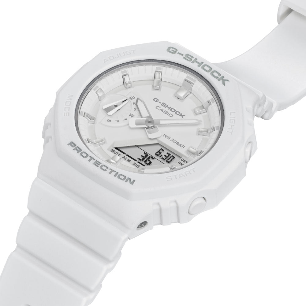 ベースモデルのGA-2100はG-SHOCKの初代モデルDW-5000Cの八角形フォルムを継承し薄型化したモデル。フラットなフェイスとシンプルなバーインデックスがシンプルながらもソリッドな印象に演出しています。