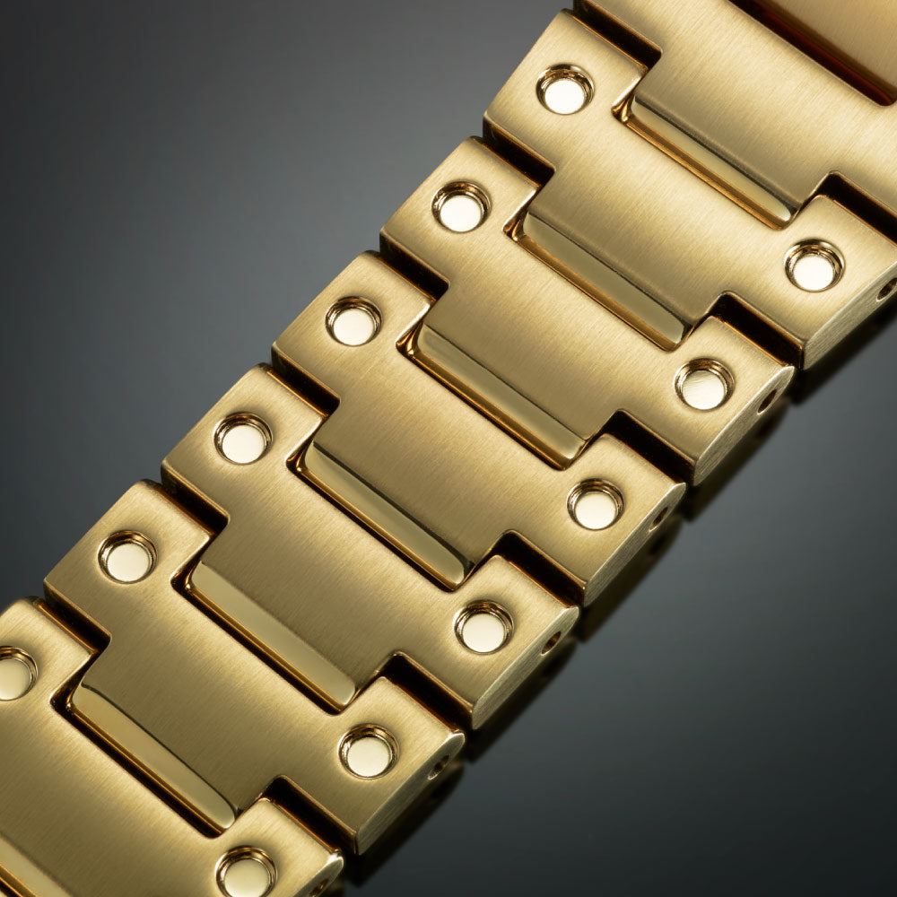 1983年に誕生したG-SHOCK初号機DW-5000C。その象徴であるスクエアデザインはそのままにフルメタル化し、スマートフォンリンクをはじめとした先進機能を搭載したGMW-B5000シリーズです。硬質なステンレス素材のメタルベゼルと本体ケース部の間にファインレジン緩衝体を挟む耐衝撃構造により、フルメタルケース化を実現。高密度実装技術によりサイズもキープしています。裏蓋には重厚感あるスクリューバックケースを採用し、耐摩耗性に優れるDLC処理を施しました。ケースとバンド全体にはゴールドIP処理を施し、美しい発色を実現。フィルムソーラーセルやSTN-LCD(液晶)を用いて視認性も良くなっています。
