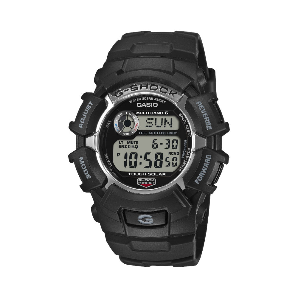 タフソーラー搭載のスタンダードモデルとして人気を博したG-2300のシンメトリーなデザインはそのままに、マルチバンド化を実現。世界6局の標準電波を受信します。飽きのこないシンプルなデザインに電波受信機能を搭載した実用的なG-SHOCKで、高輝度なLEDバックライトを搭載することで暗所での視認性も確保しています。