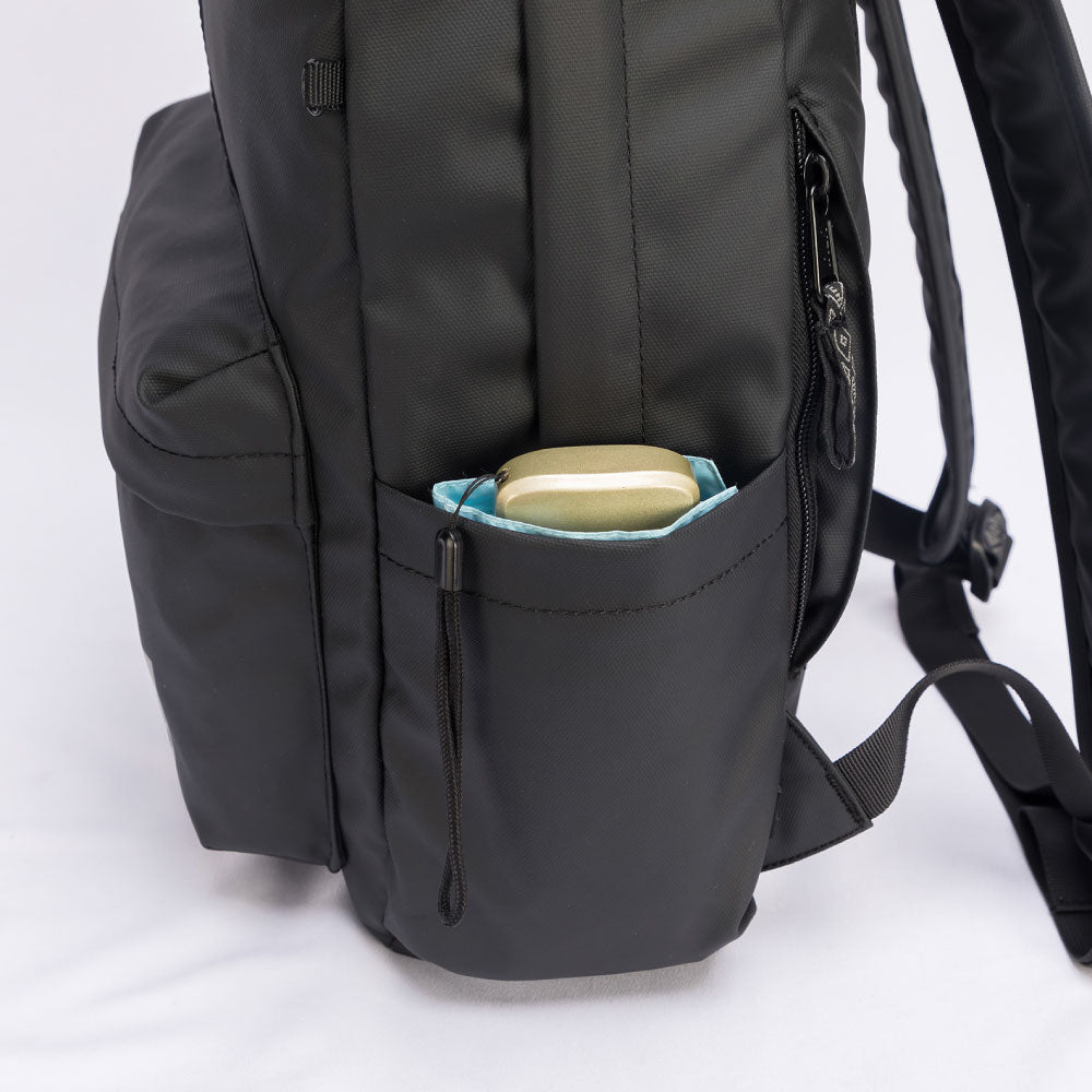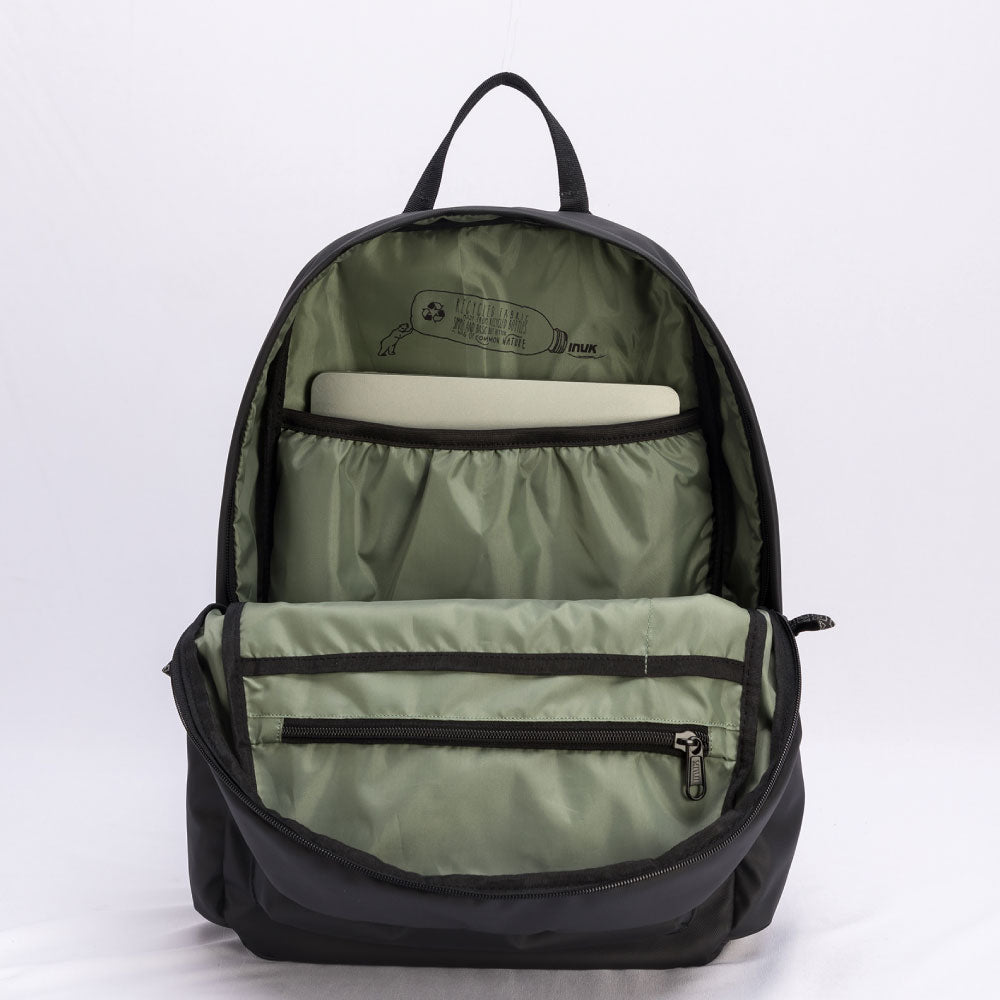 飽きの来ないベーシックデザインの定番モデル。しっかりPC(15インチまで)も入れることができ、前面にマチのあるポケット、サイドポケット、背面には隠しポケット(セキュリティーポケット)がありコンパクトながらデイリーユースにぴったりなバックパックです。内側の色は、荷物の取り出しがしやすい、視認性の良いグリーン色です。