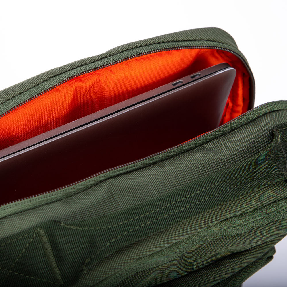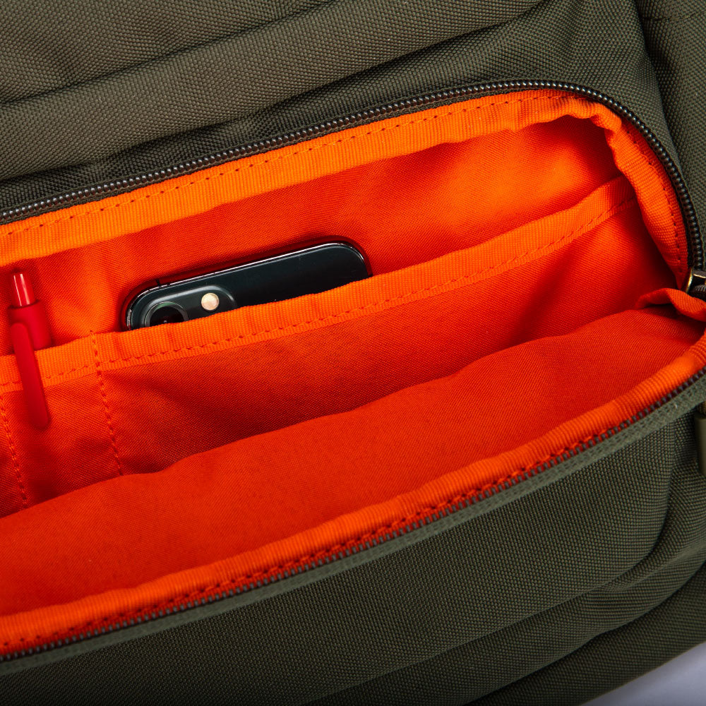 外出が多い方やテレワークが多い方、ノマドワーカーにオススメです。PC用の専用ポケット(15インチまで)があり、ガジェット類の収納に便利なオーガイザーポケットが前面ついています。背面の隠しポケット(セキュリティポケット)、左右の外ポケットもあります。内側の色は、荷物の取り出しがしやすい、視認性の良いオレンジ色です。
