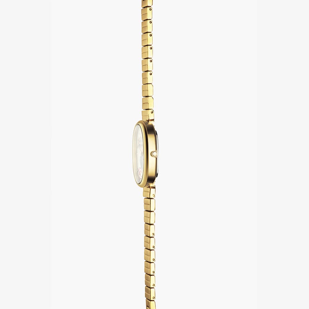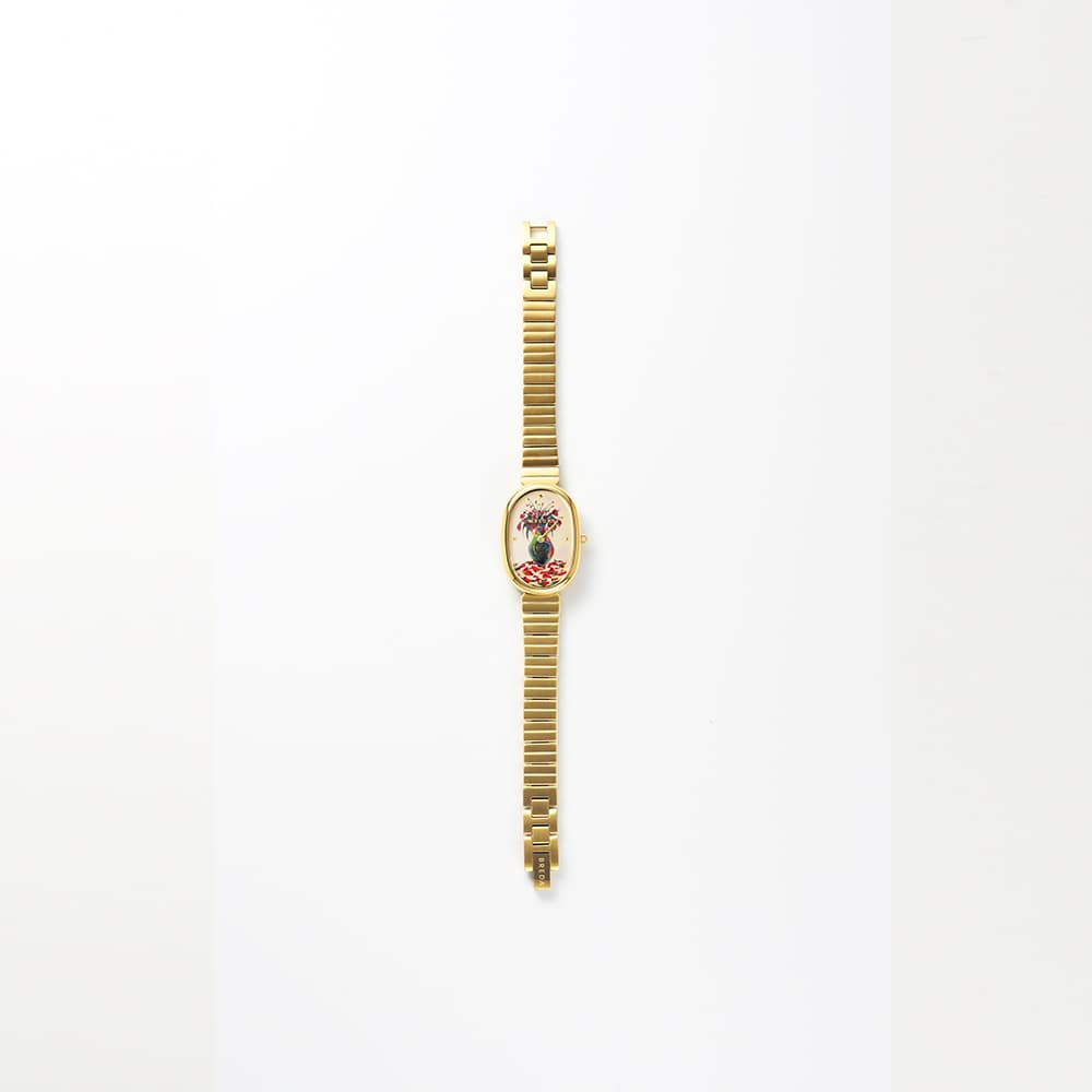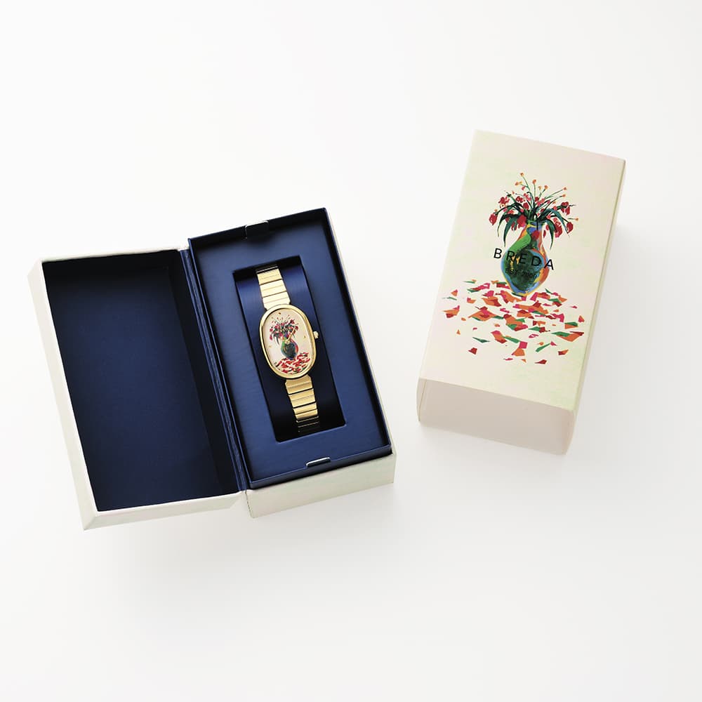 1741AININA-GD Special Editionは、国内外の著名ミュージシャンのMV等を手掛けるアーティスト「藍にいな」とのコラボで誕生した限定アイテム。 今回「藍にいな」が初めて時計のために描き下ろしたグラフィックには、美しく散っていく花と一面を覆う花びらが描かれ、「時間はカラフルに積み重なっていく」という思いが込められました。繊細で丸みを帯びた23mmのオーバルケースが文字盤のグラフィックを引き立て、細めのメタルベルトとともに、華やかでエレガントなアクセサリーのようなレディースウォッチに仕上がっています。※数量限定モデル