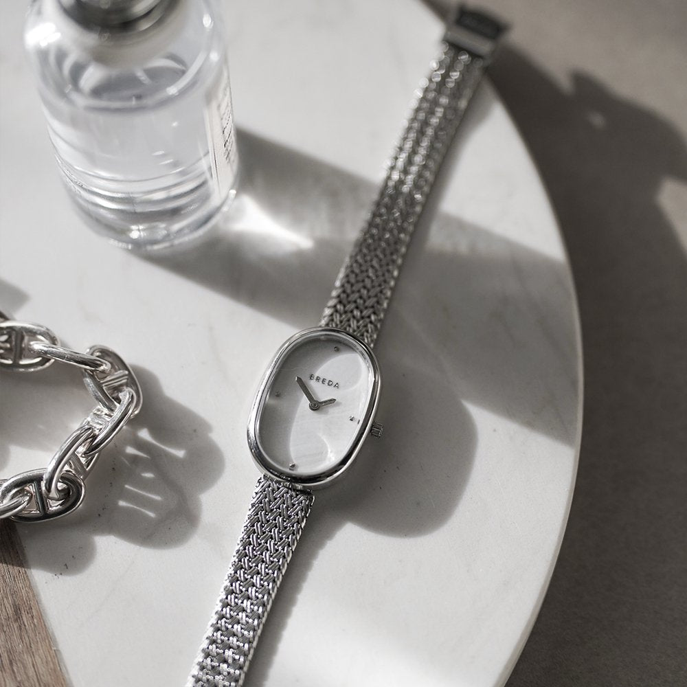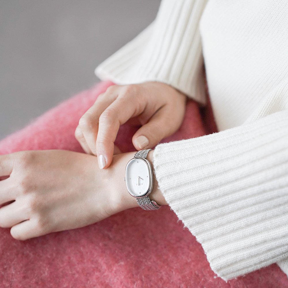 1741m(JANE TETHERED Collection)は「つながり」を表した言葉でブレスレットの形状から名付けられています。世界や人とのつながりを思い出させてくれるようなタイムピース。穏やかな太陽の日差しの中、水辺で過ごした休日からインスピレーションを受けデザインされたデザインウォッチ。 繊細な23mmの楕円形のケース、上品なマザーオブパールのダイヤルやジュエリーらしい細めのメタルベルトはエレガントでクラシックなスタイルの腕時計です。