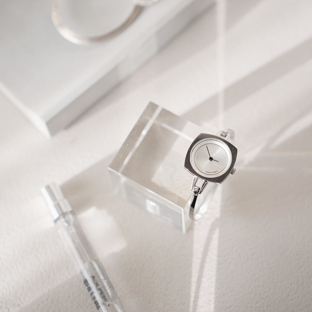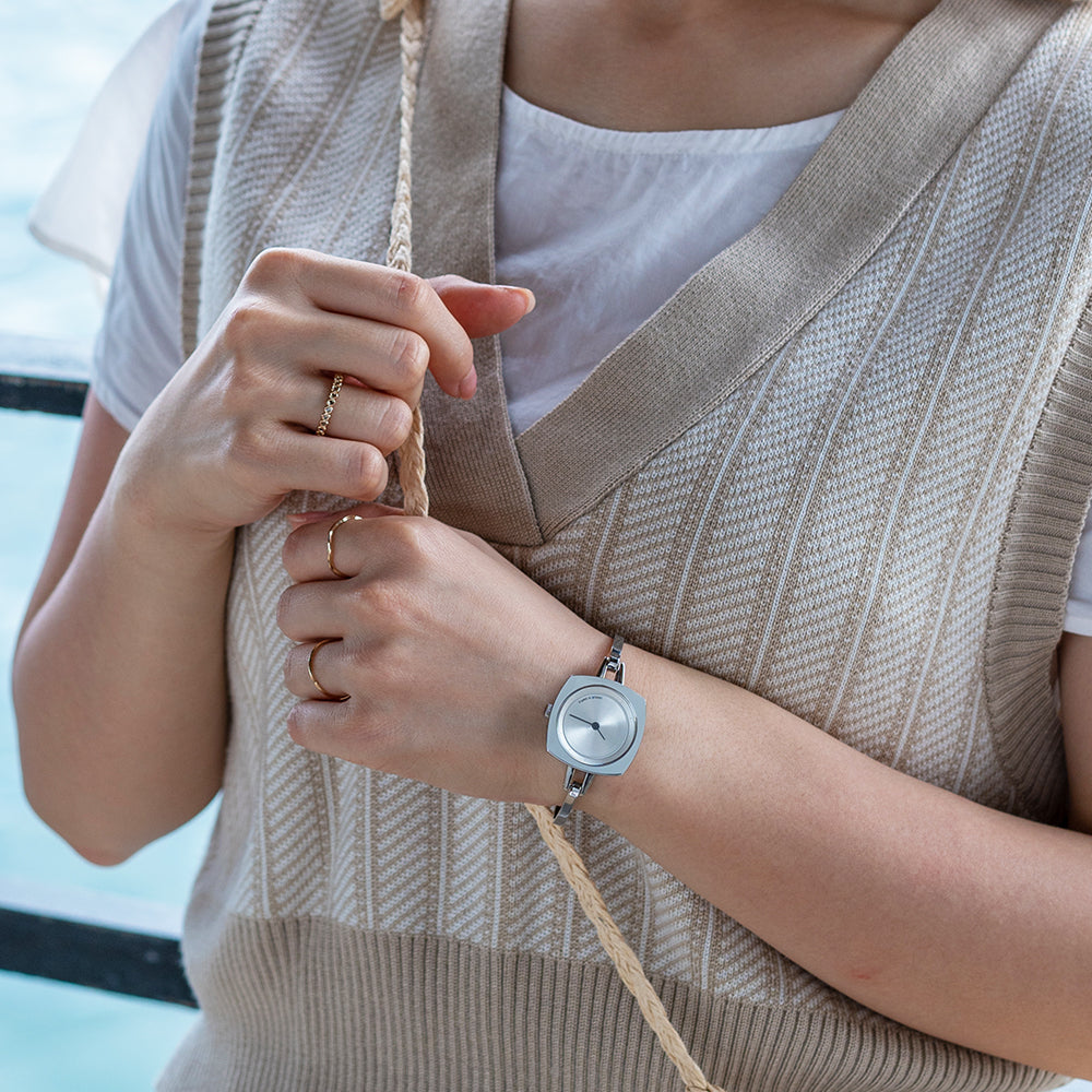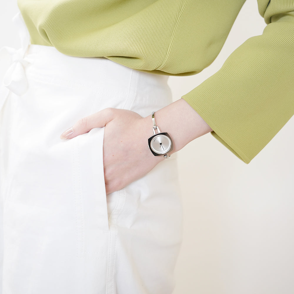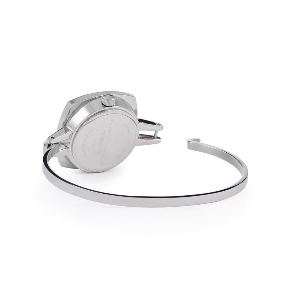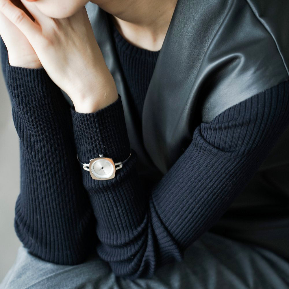 TS2202A(TURN TABLE)は、 ターンテーブルにインスパイアされたバングルタイプのレディースウォッチ。 華奢で上品に仕上げ、手元を華やかに彩るアクセサリーのようなデザインに仕上がっています。重さは25gと現在展開しているTACSのコレクションの中では、最軽量。ベルト幅3mmのバングルは、装着感も良く、素肌にも、薄い服の上にも付けられます。文字盤はシンプルにまとめられ、裏蓋にコレクション名が刻印されています。商品スペック