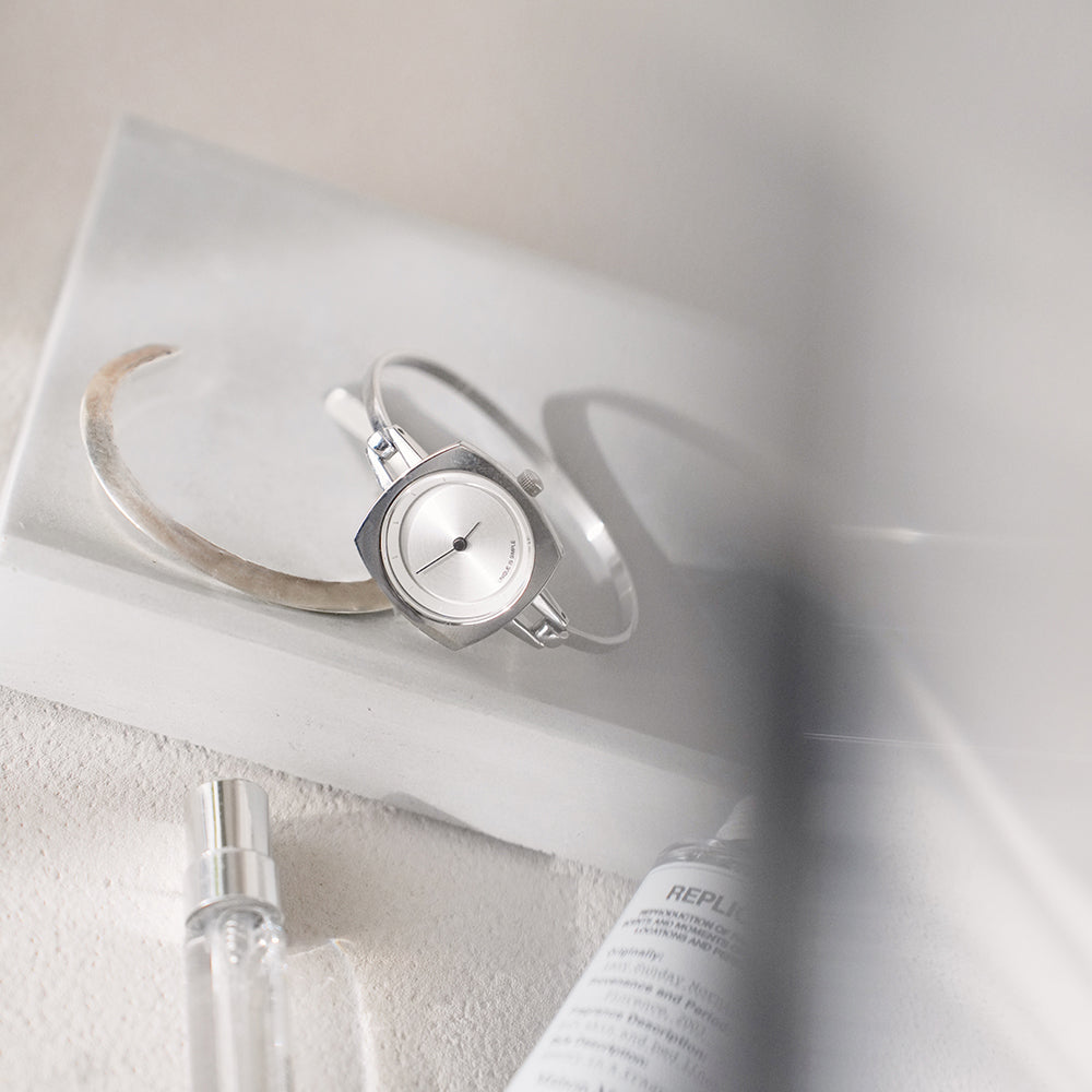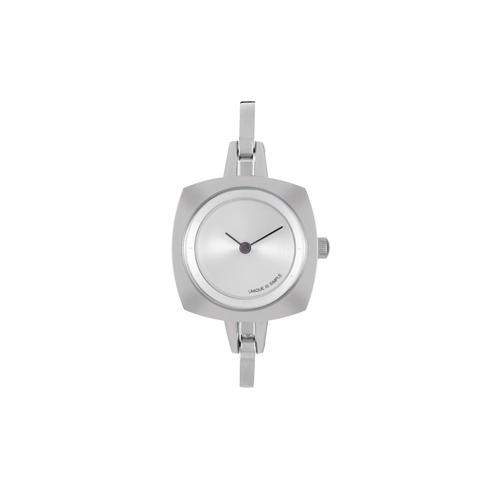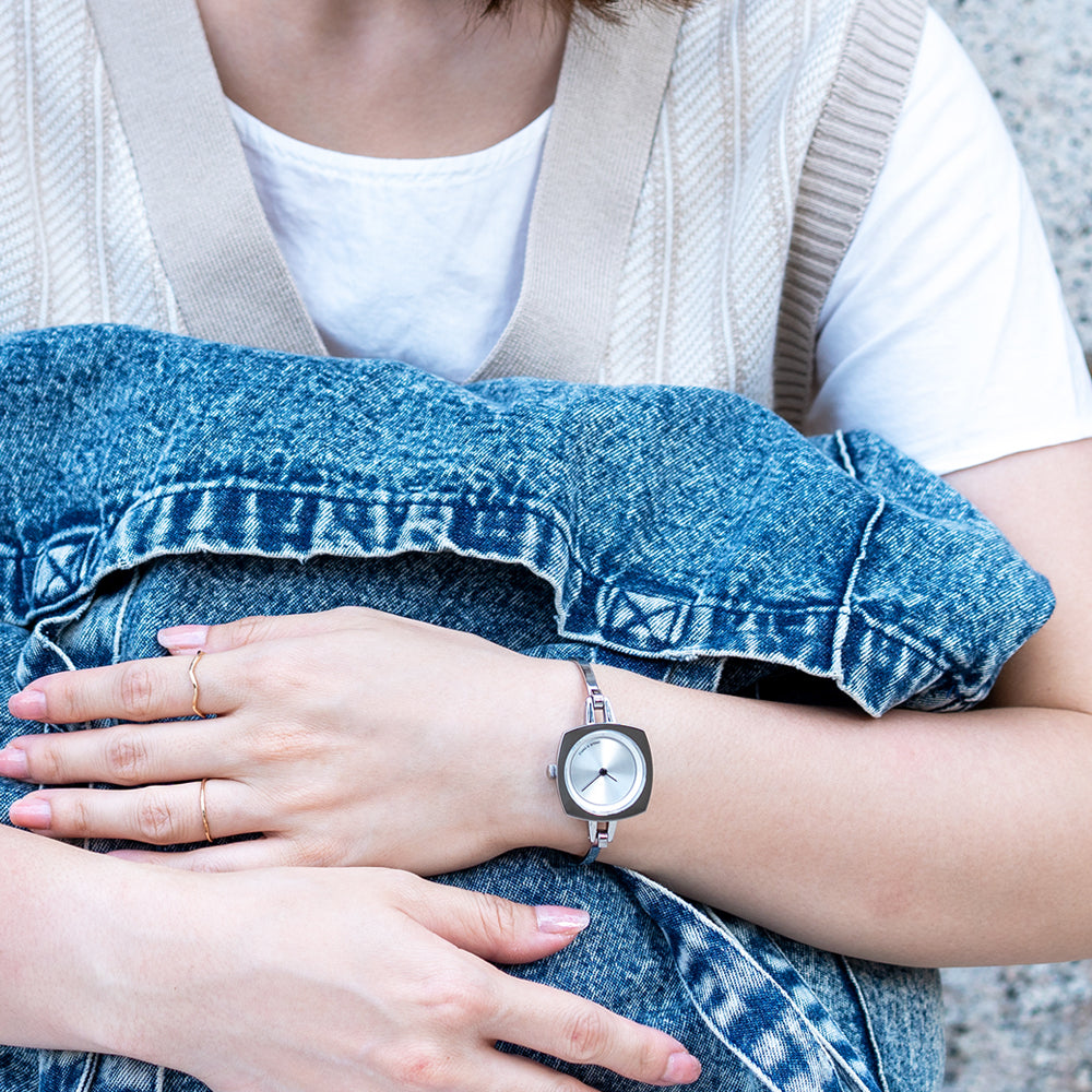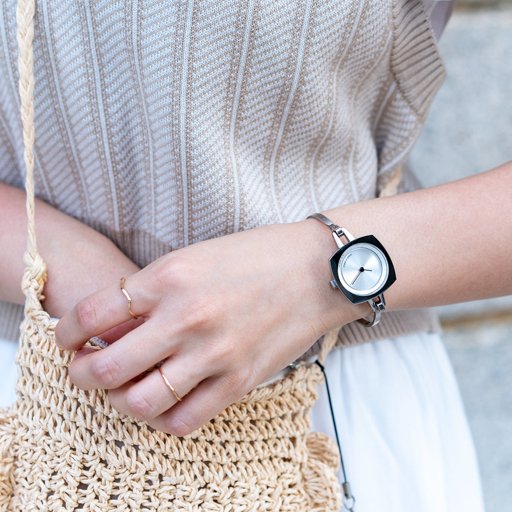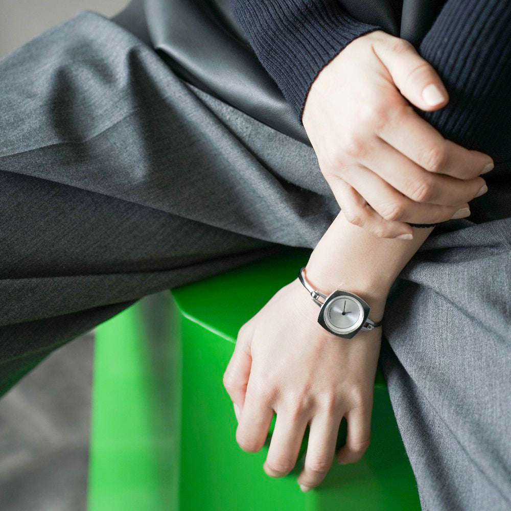 TS2202A(TURN TABLE)は、 ターンテーブルにインスパイアされたバングルタイプのレディースウォッチ。 華奢で上品に仕上げ、手元を華やかに彩るアクセサリーのようなデザインに仕上がっています。重さは25gと現在展開しているTACSのコレクションの中では、最軽量。ベルト幅3mmのバングルは、装着感も良く、素肌にも、薄い服の上にも付けられます。文字盤はシンプルにまとめられ、裏蓋にコレクション名が刻印されています。商品スペック