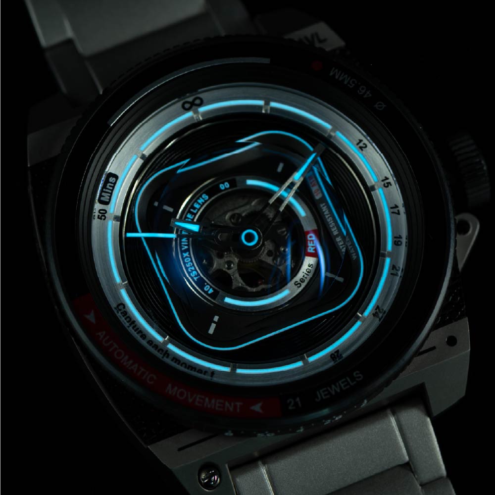 暗闇で柔らかく光り、時間とレンズの輪郭を美しく浮かび上がらせます。