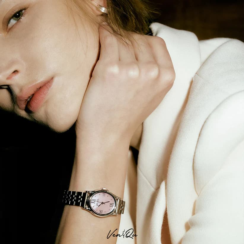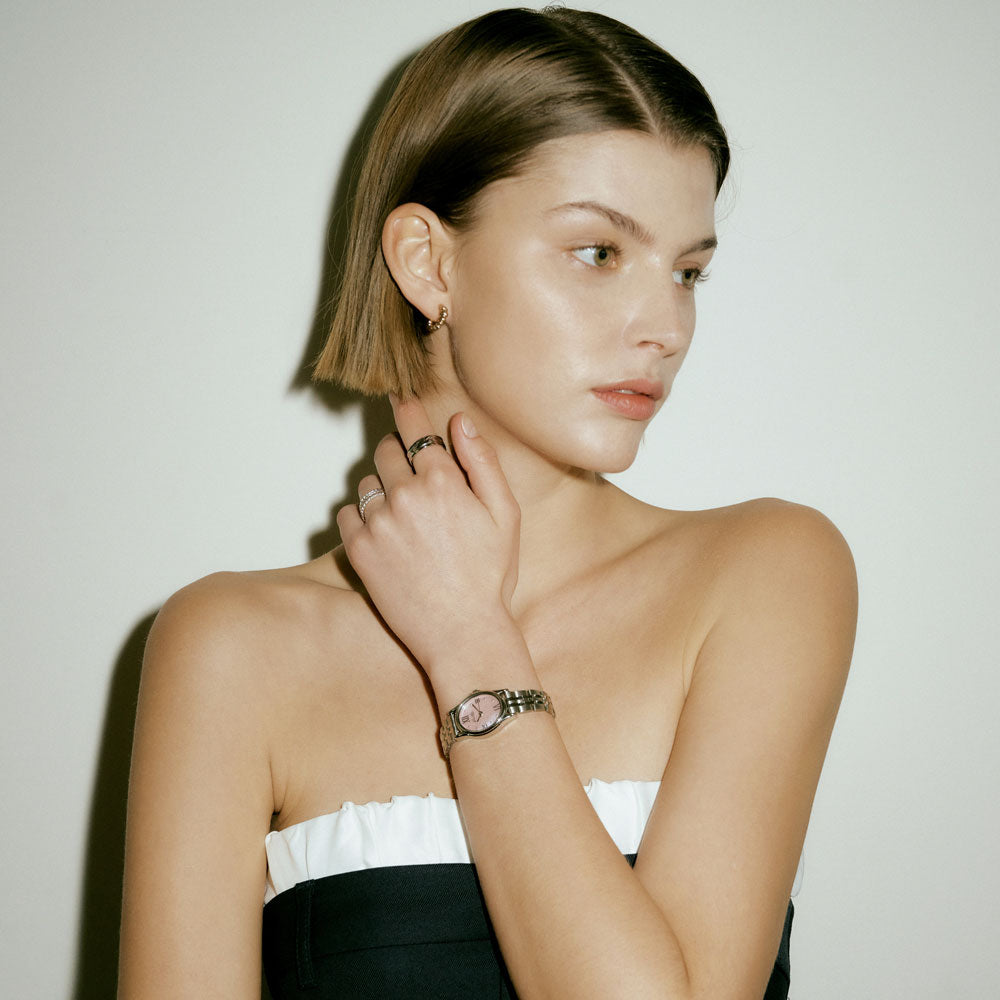 ケースとベゼル部分を多角にすることで、よりエレガントで、ジュエリーのように輝きを放ちます。湖面の揺らめきの様に表情を変化させるシェル文字盤や、深いグリーンに光る文字盤など、このコレクションでは、自然の要素を取り入れることで、その輝きと調和をデザインに映し出しています。