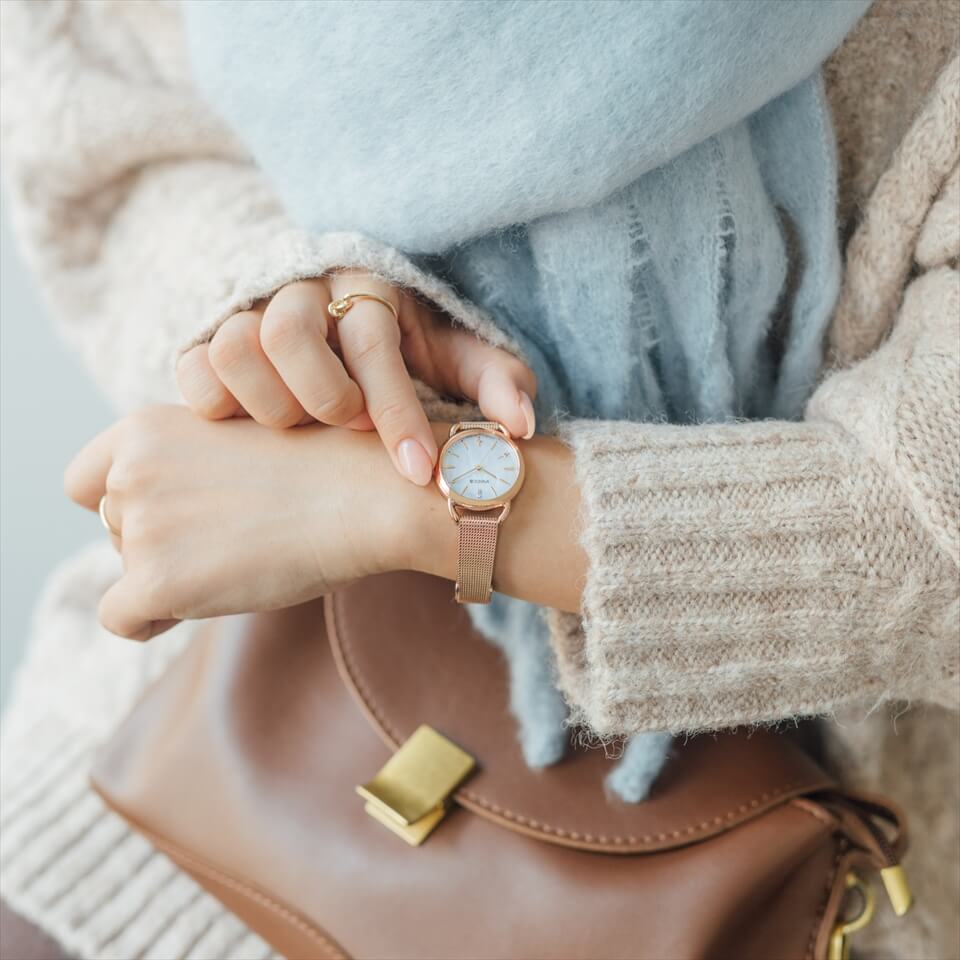 白蝶貝文字板にシンプルなバーインデックスを組み合わせた、アクセサリー感覚で使用できる1本です。12時の位置には2ポイントのクリスタルガラス、2時と8時位置のインデックスには雪のきらめきを表現したさりげない装飾をプラス。その日のメイクやファッションに合わせて印象を変えられる、グレージュの替えバンドをセットした2way仕様です。ご自身でバンドの付け替えができるインターチェンジャブル構造を採用しています。