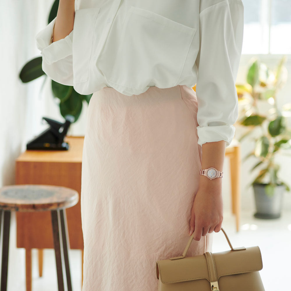 満開の美しいカメリア(椿)をモチーフにデザインした白蝶貝の文字板には、エッチングの花模様と“光の粒”が花びらに乗っているかのようなドットパターンを組み合わせ、愛らしさを表現しています。外周のピンクのグラデーションが、カメリアの華やかさと可愛らしさを引き立てています。