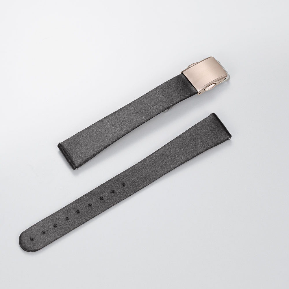 文字板にはほんのりとベージュカラーを重ね、中央には繊細なアンティークレースをモチーフにしたパターンをエッチングで描いています。12時と6時位置にはラボグロウン・ダイヤモンドをセッティング。ネックレスのような装飾が、さりげないアクセントとして輝きを添えます。ダークグレーのサテン調バンドをセットした2Way仕様で、気分やシーンに合わせて簡単にバンド交換ができるインターチェンジャブル構造を採用しています。
