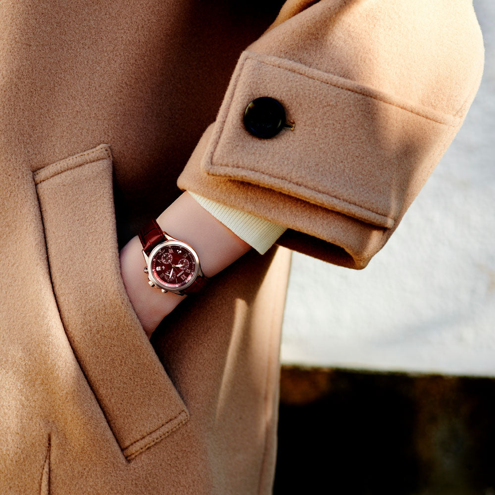 インデックスにはローマ数字を採用し、すっきりとした印象に仕上げました。型押しされたダークレッドの革バンドが上質感を高め、手元を美しく、女性らしく引き立てます。