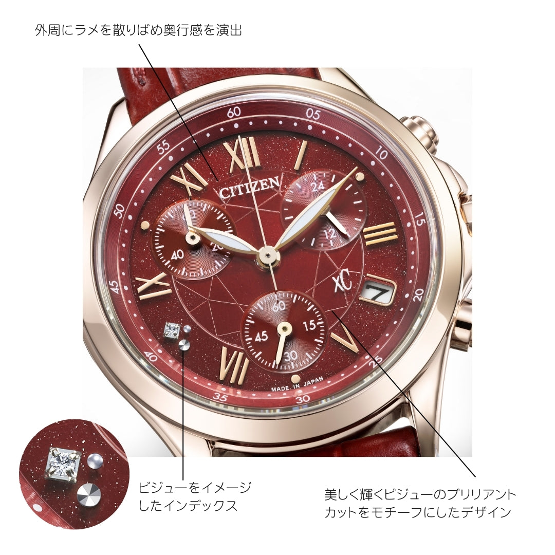 華やかなサクラカラーのケースにダークレッドを組み合わせた、存在感あふれる限定モデルです。ダークレッドの文字板には、ブリリアントカットのビジューをモチーフにしたパターンをあしらい、外周にはラメを散りばめた美しいデザインに。手元を見るたびに、気持ちが華やぎ、自分らしく輝ける自信を与えてくれます。