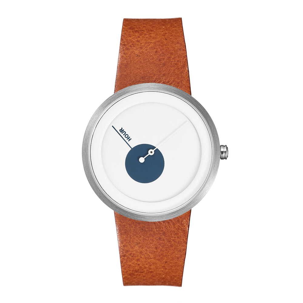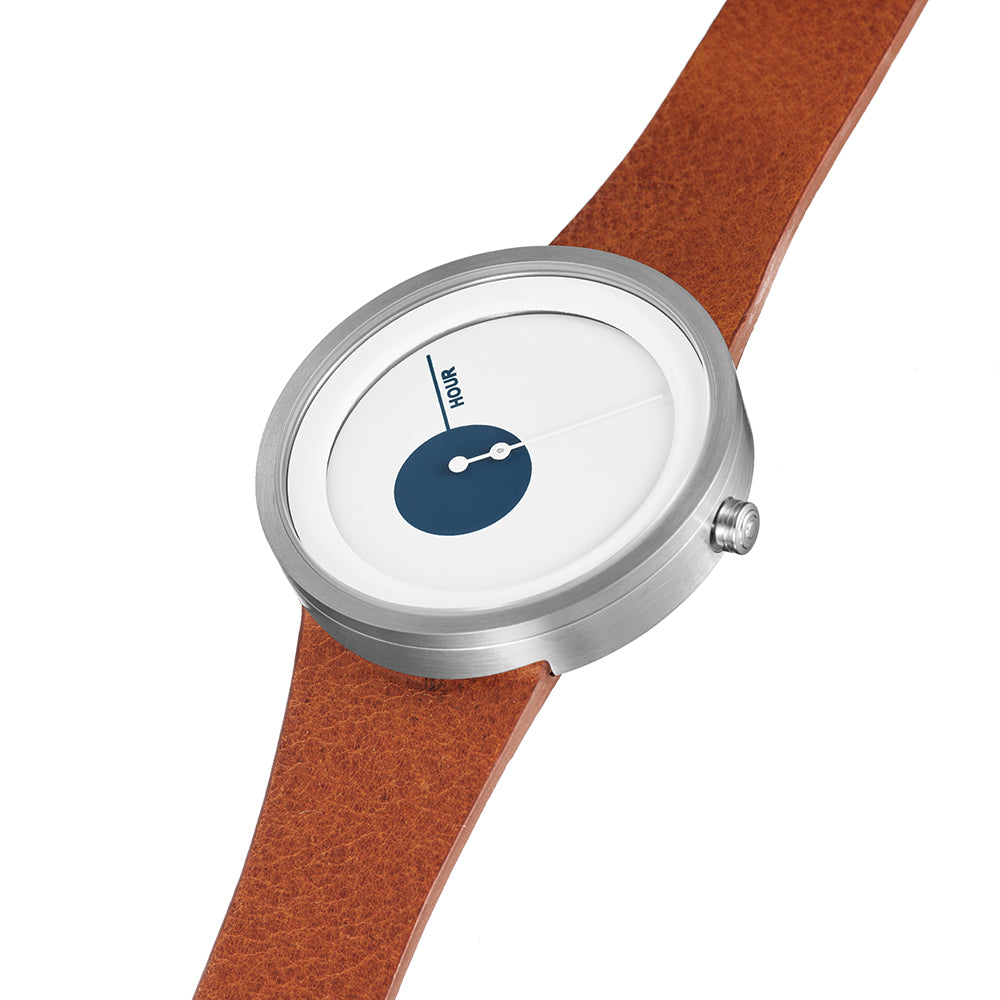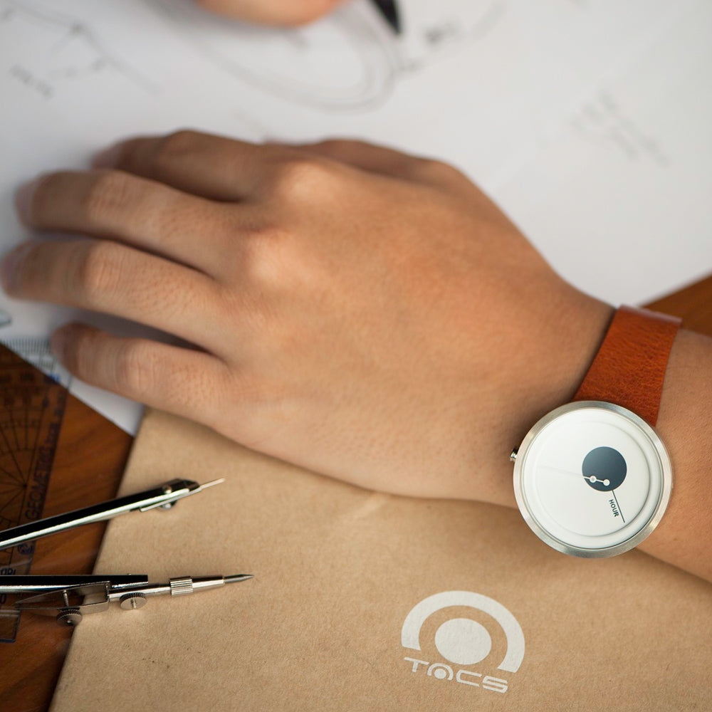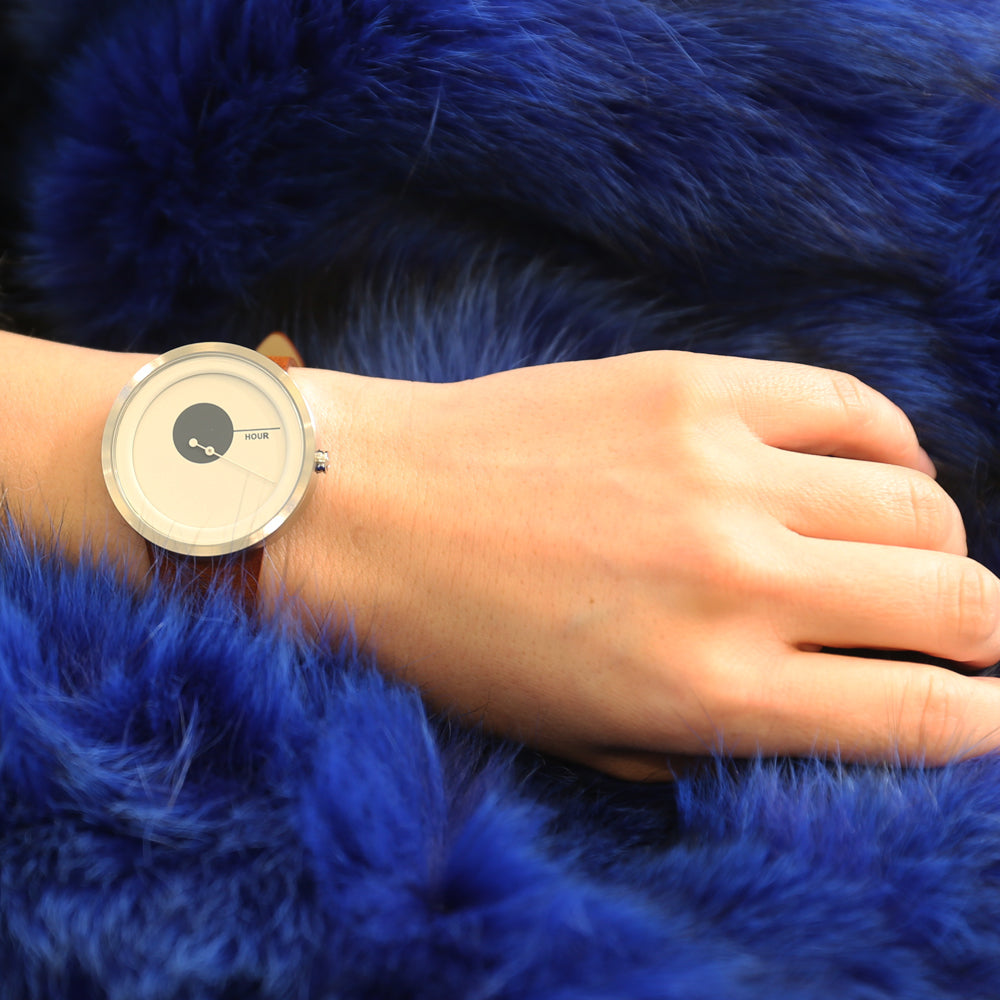 新しい時の表現従来の腕時計とは違い、時を示す針は中心部の周りを、まるで衛星のように周回する。数秒ごとに進む針と、衛星のように周回する時の流れを融合。新たな時間の概念として感じ取れるデザイン。