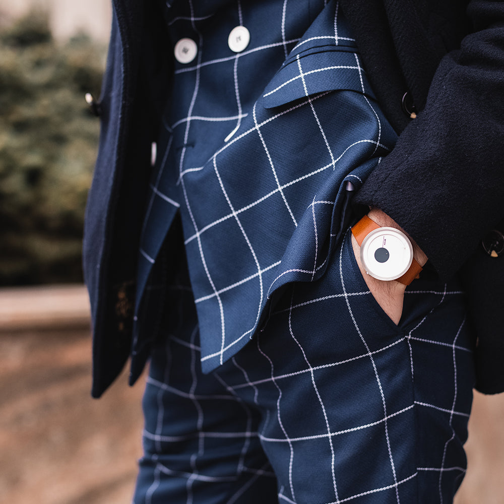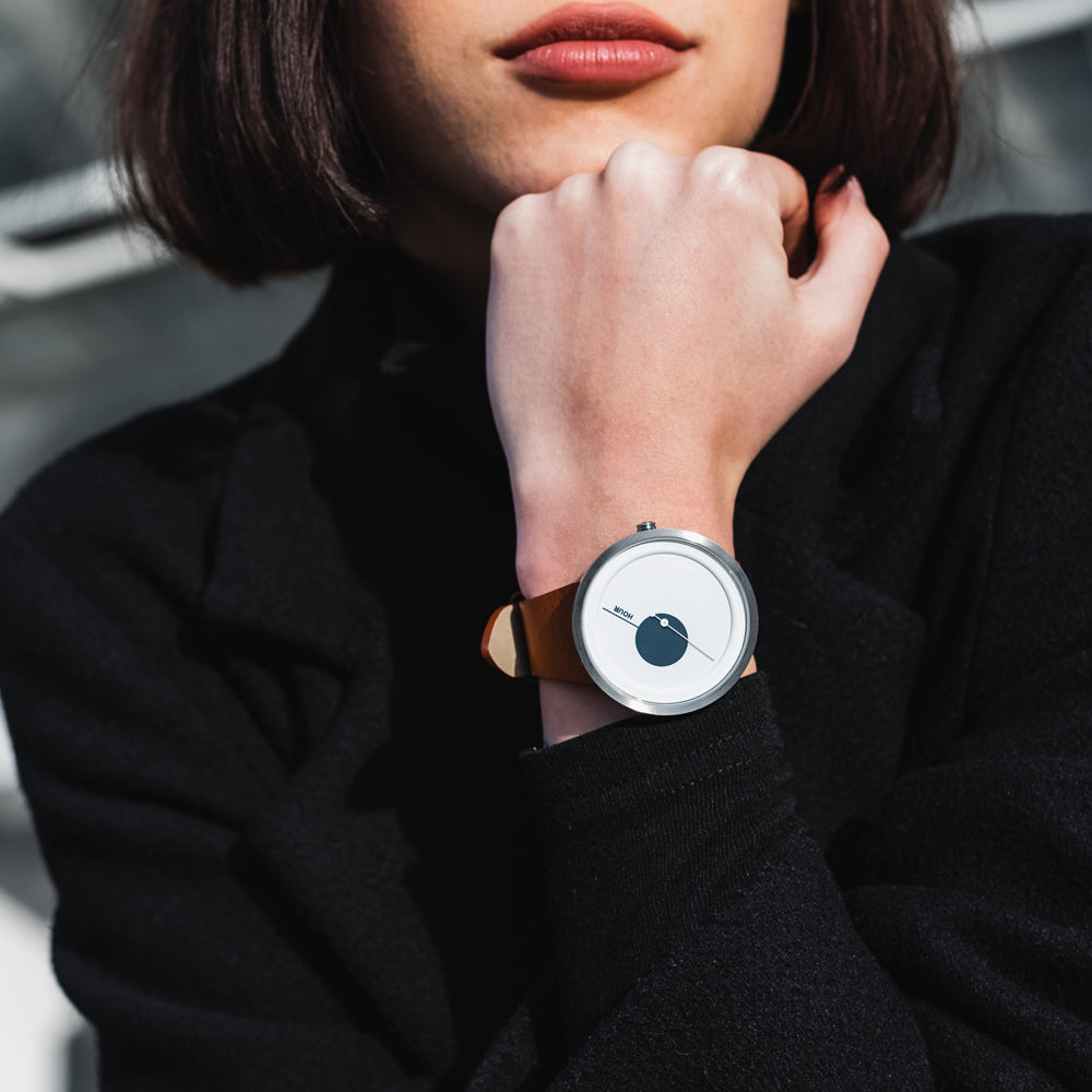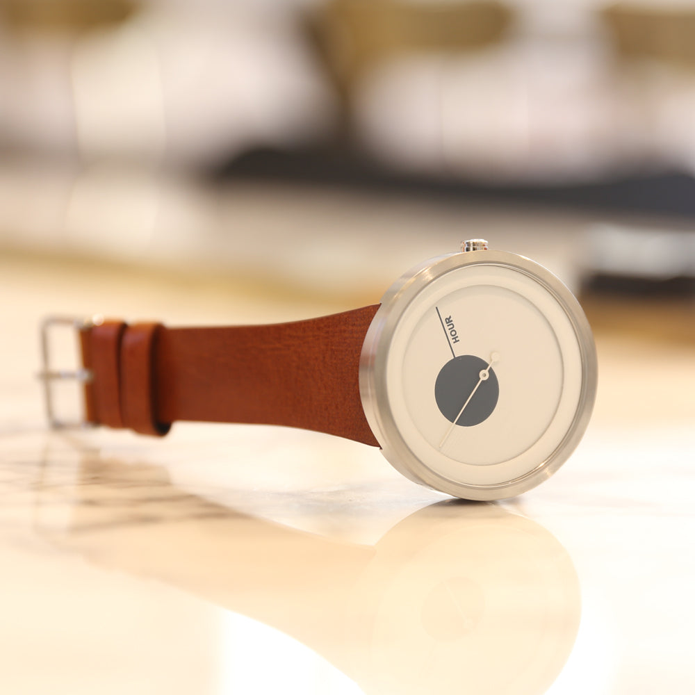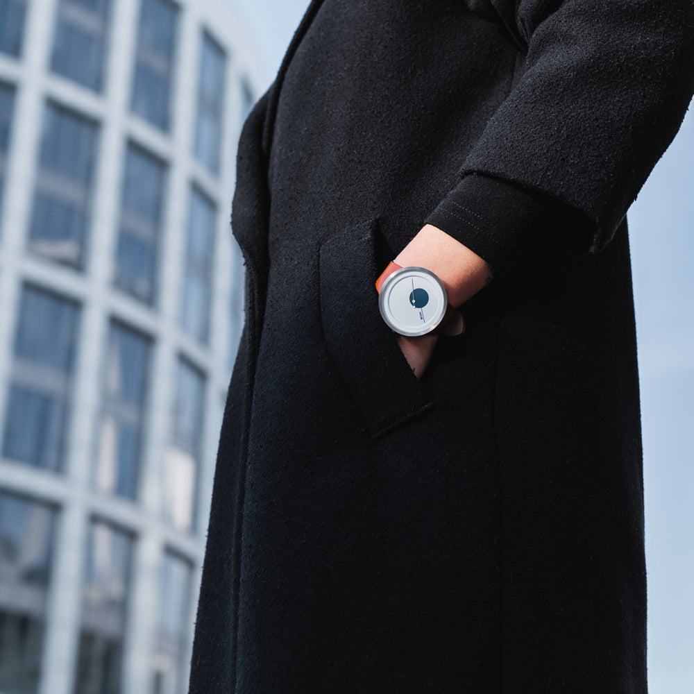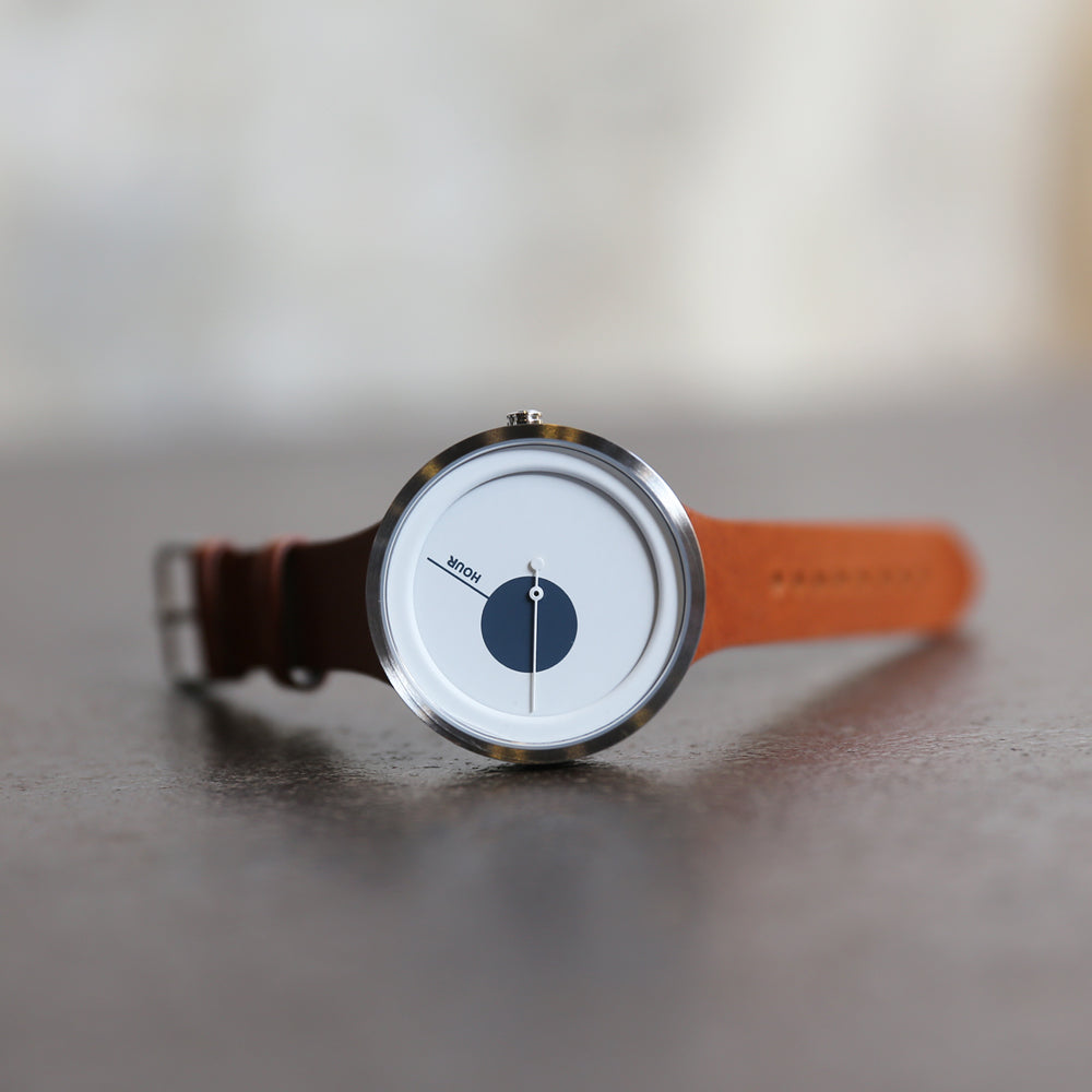 回転する文字盤はシンプルな配色で、点と線と面のグラフィカルな美しさが率直に伝わるデザイン。腕元にクリエイティブなデザインを取り入れたい人には最適。
